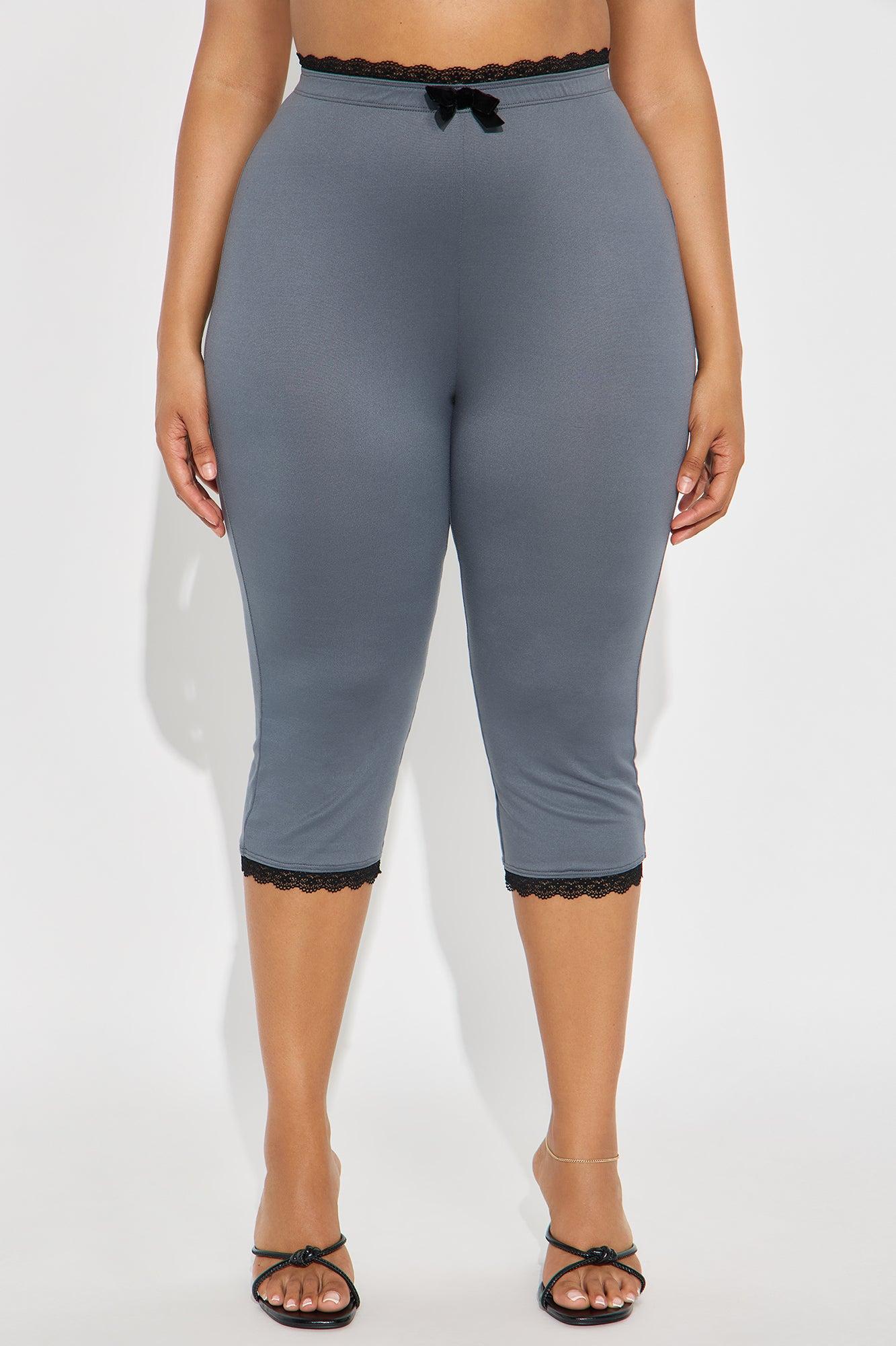 Available In Brown, Burgundy, Charcoal, Navy, Pink And SkyBlue. Capri Legging High Rise Elastic Waistband Bow Detail Lace Trim Stretch 19" Inseam 96% Polyester 4% Spandex Imported California Proposition 65WARNING: Cancer and Reproductive Harm - www.P65Warnings.ca.gov.