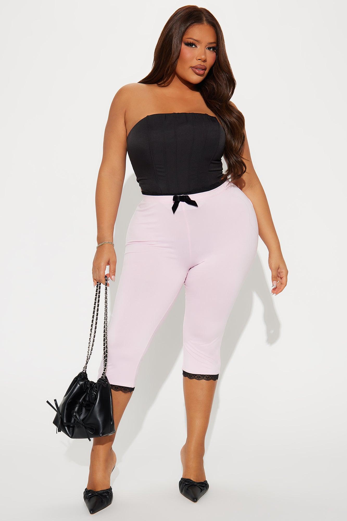 Available In Brown, Burgundy, Charcoal, Navy, Pink And SkyBlue. Capri Legging High Rise Elastic Waistband Bow Detail Lace Trim Stretch 19" Inseam 96% Polyester 4% Spandex Imported California Proposition 65WARNING: Cancer and Reproductive Harm - www.P65Warnings.ca.gov.