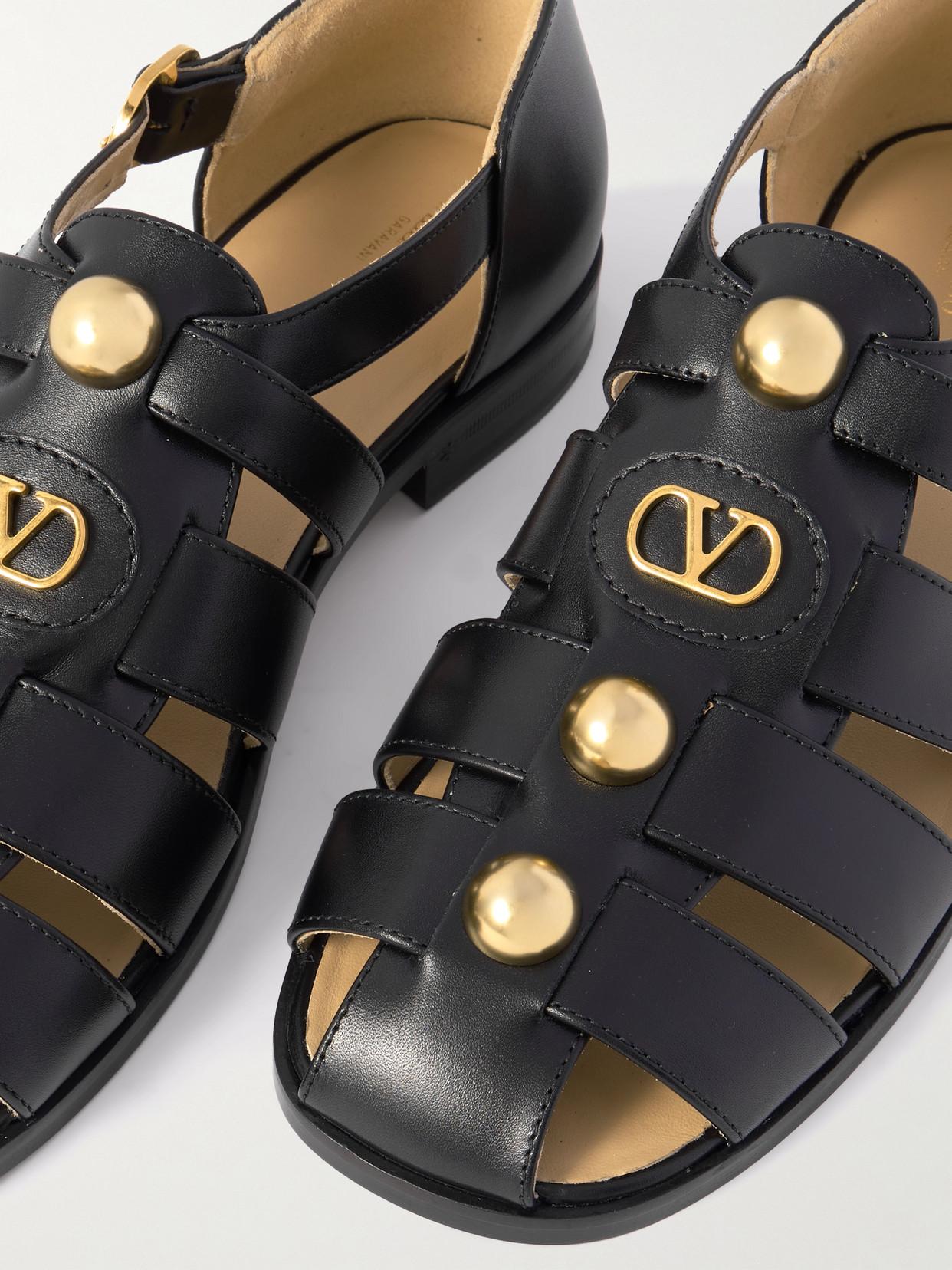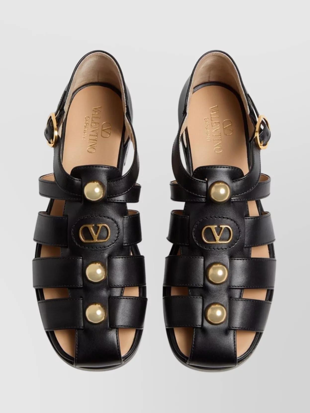 Shop Valentino Garavani Vlogo Signature Faux-pearl Flat Sandals In Black from 800+ stores, starting at $760. Elevate your summer footwear collection with the Valentino VLogo Leather Sandal. Crafted in Italy from black leather and adorned with gold-tone hardware, this sandal features a striking Vlogo accent for a touch of luxury. The buckle closure ensures a secure fit, while the lightly padded leather insole and smooth leather sole provide all-day comfort. With a modest 1-inch heel, this sandal is both stylish and practical. Please note that size selections are European, so we recommend referencing the size chart for US conversions. Feedback has shown that this brand typically runs small, so we suggest sizing up a half size for the best fit. Rest assured that our products are 100% genuine, sourced from trusted independent suppliers. Add a touch of signature elegance with a modern aesthetic to your wardrobe with the Valentino VLogo Leather Sandal.
