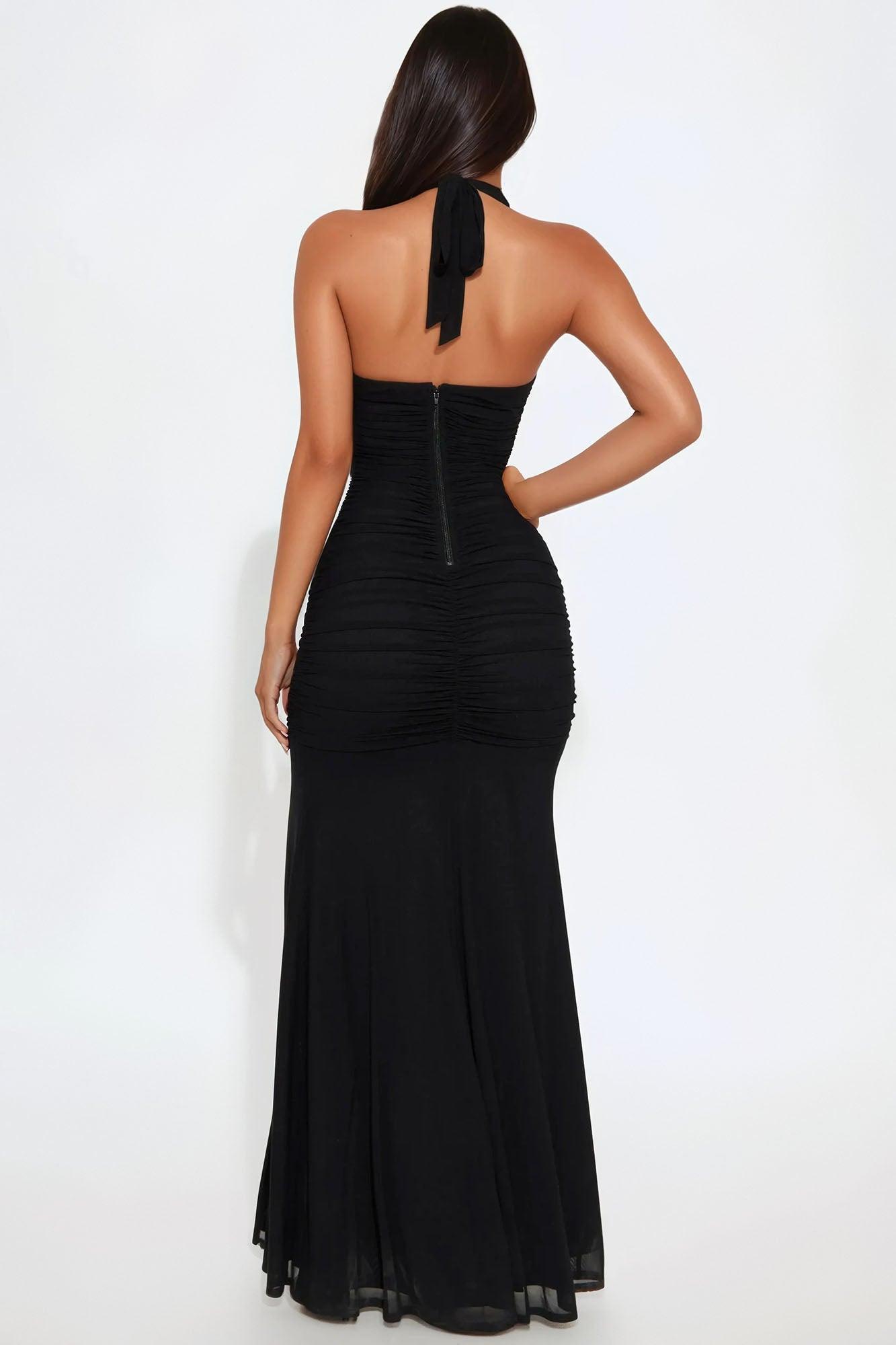 Valerie Mesh Ruched Halter Maxi Dress - Black