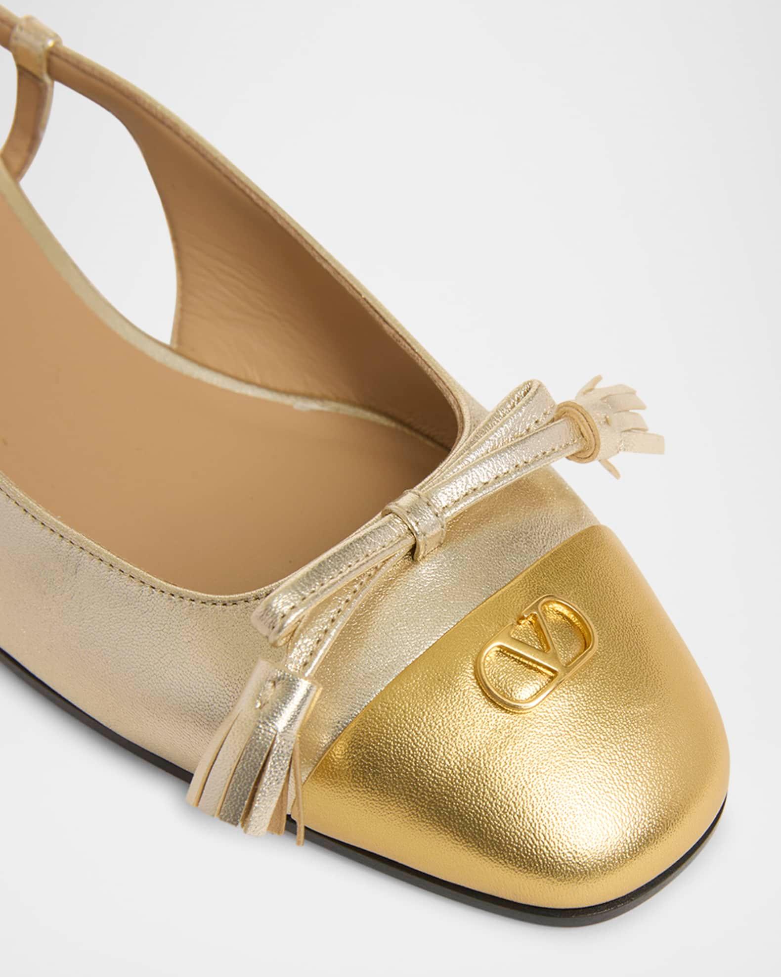 Valentino ballerina flats in two-tone metallic leather with signature VLogo detail 1.00 in / 25 mm no heel or flat heel Square cap toe Adjustable slingback buckle strap Leather outsole Lining: Leather Made in Italy Size Note: Valentino Garavani shoes run small. Please order a 1/2 size larger than you typically wear.