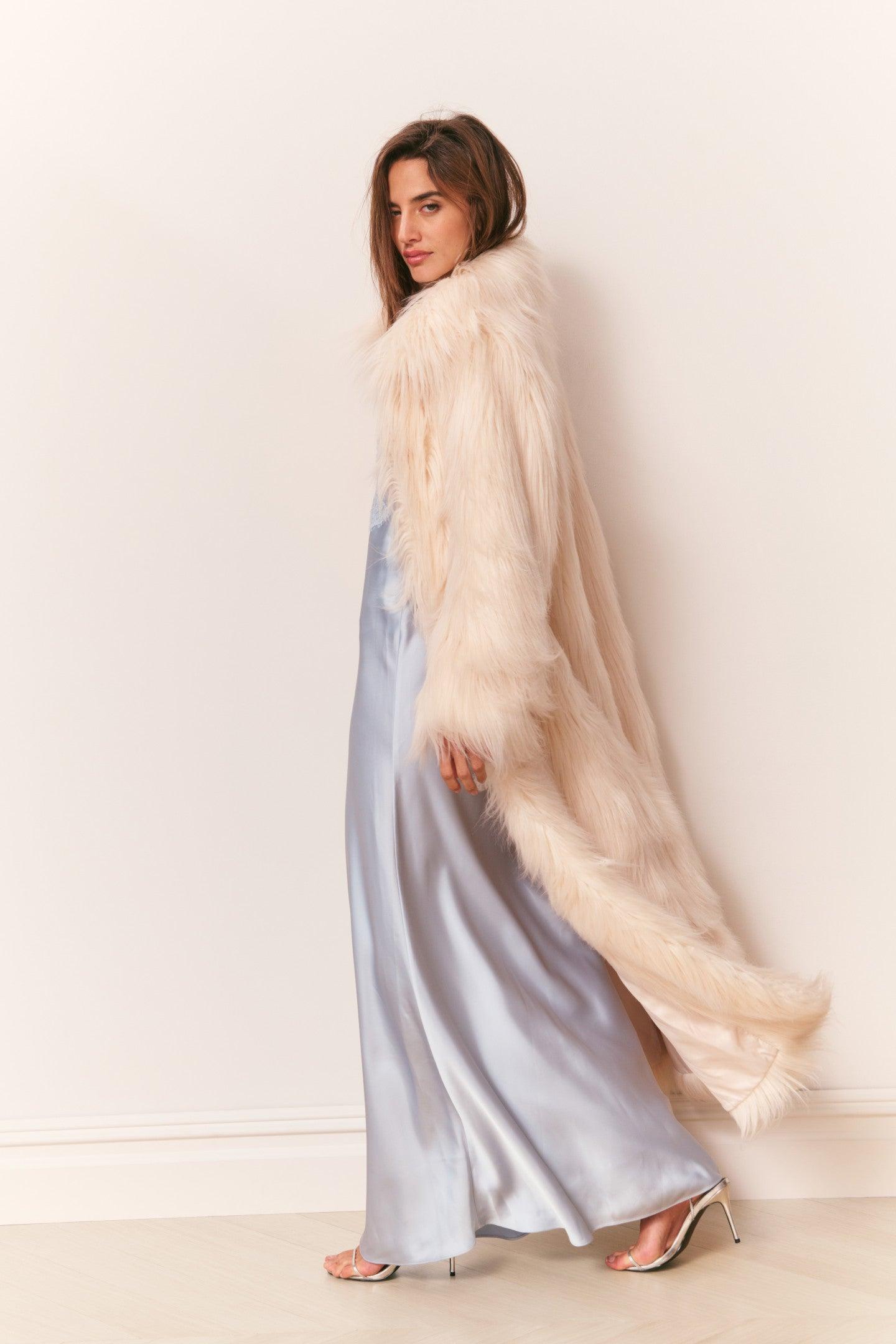 The Valia Coat is a floor-length faux shearling duster. Crafted from a plush underbrush faux shearling, it features a dramatic, oversized silhouette with long, roomy sleeves and a generous collar. Fur hook-and-eye closures and side pockets add functional detail, making it perfect for layering over everything from evening dresses to cozy knits. A statement piece for chilly days, the Valia coat is a must. Details: 68% Modacrylic, 17% Acrylic, 15% Polyester Floor-length, oversized duster silhouette Fur hook-and-eye closures Side pockets