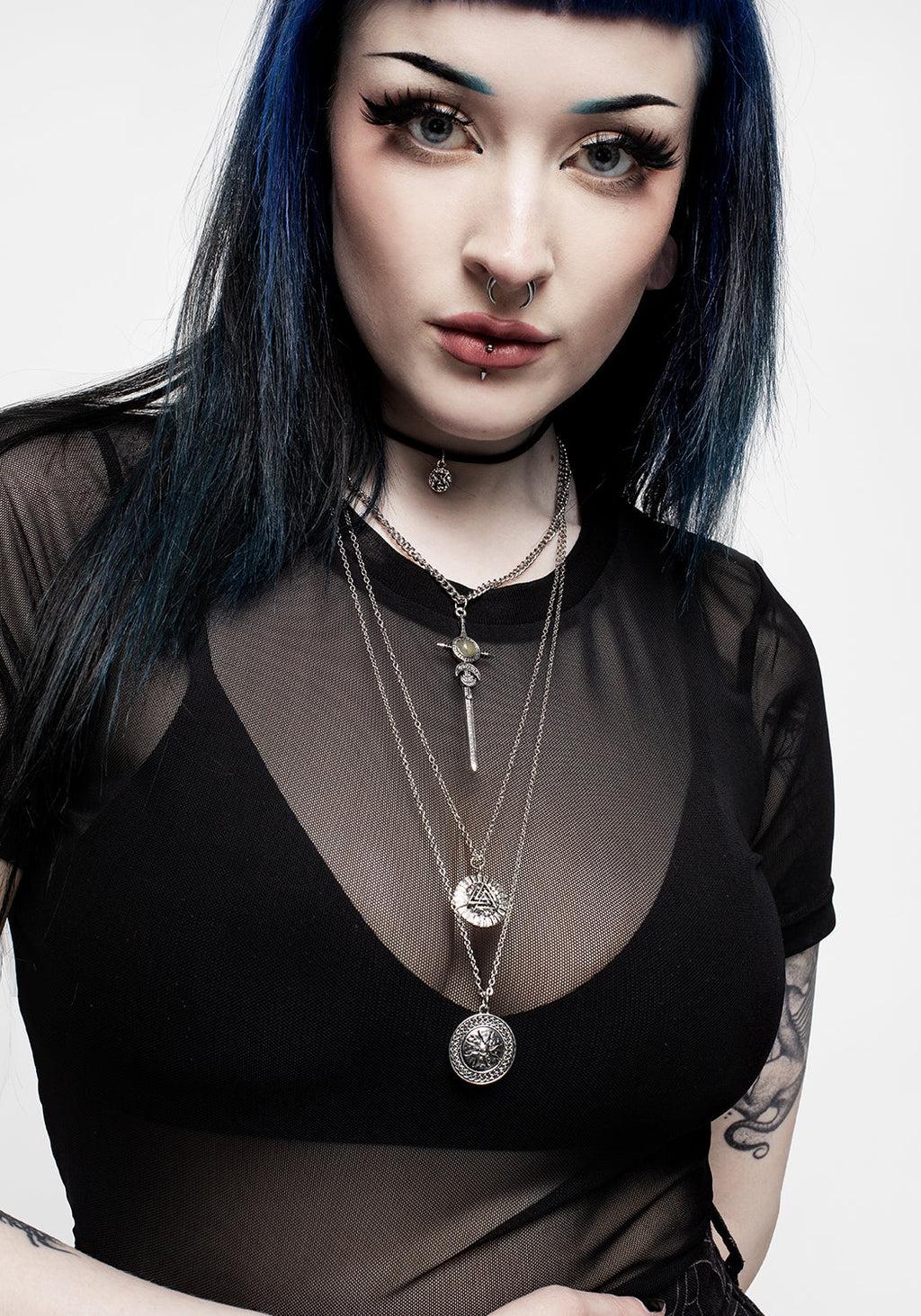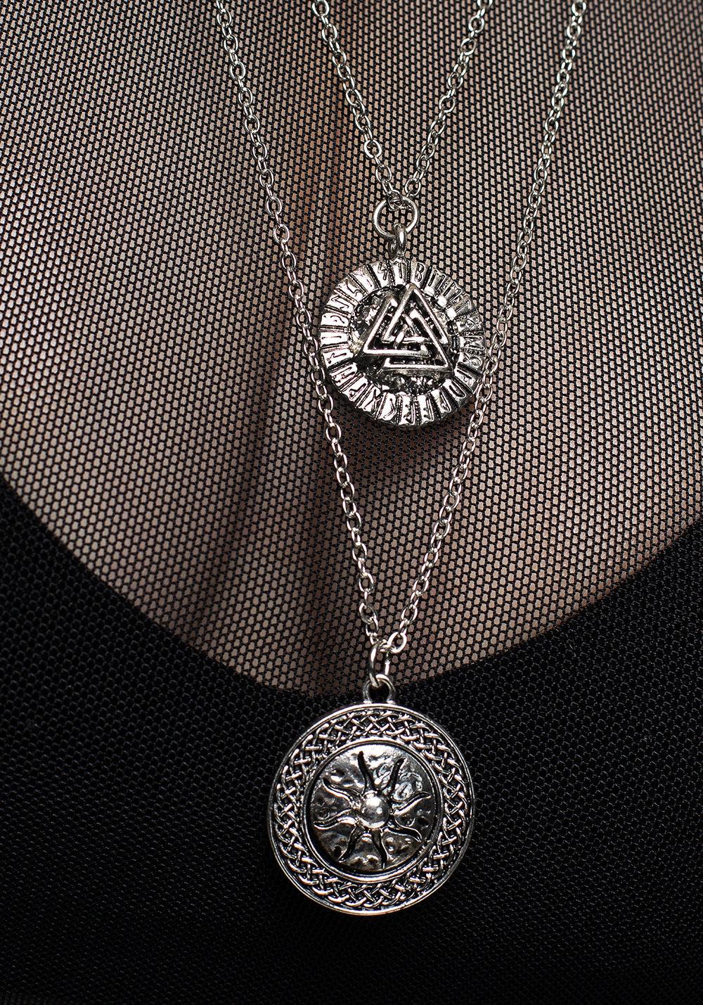 Exceedingly beautiful and multifaceted, this runic-inspired layered necklace effortlessly imbues your look with the sort of ancient mysticism most could only dream of. Intricate cast circular charms hang from delicate silver chains beneath a statement sword pendant set with a semi-precious stone – all finished with a suedette choker strap detail. Perfectly co-ordinated, and with practically no effort on your part. All that's missing is your throne! - COLOUR: Silver - COMPOSITION: Metal alloy - GEMSTONE: Semi-precious - CHAIN LENGTH: 30cm, 40cm, 60cm, 70cm + 8cm extension chain - PENDANTS: 1cm, 7cm, 2cm, 2.5cm