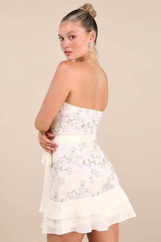 Requirements for an adorable day start with this strapless mini dress, adorned with sweet floral embroidery across the airy woven composition. The seamed bodice features a tying sash waist, all atop a fitted A-line skirt with a flirty tiered hem that calls attention with every step. Hidden no-slip strips and a hidden back zipper/clasp.