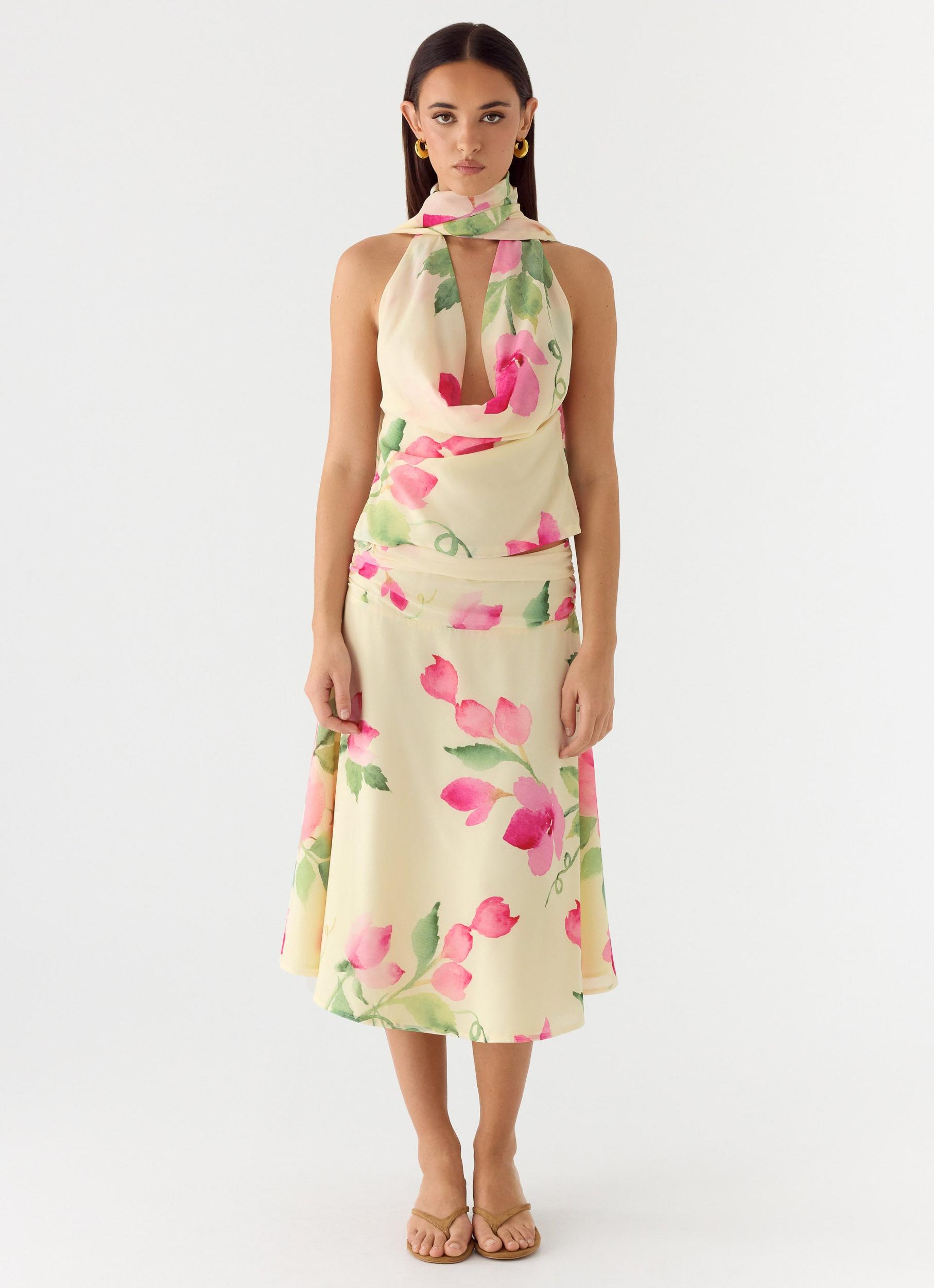 Peppermayo Exclusive The Valley Midi Skirt is made for nights that linger under golden skies. Featuring a low-rise fit with a ruched side waistband, this fully lined skirt is finished with a side hook and eye and invisible zipper for a seamless silhouette. Crafted in an exclusive print, it pairs perfectly as part of a two-piece set. - Midi length- Low rise- Ruched side waistband- Fully lined- Side hook and eye- Invisible zipper- Exclusive print (print placement will differ per garment)- Fabric: 100% Polyester, Lining: 95% Polyester, 5% Spandex Size AU 8 / US 4 garment measurements: Waist: 79 cm / 31.1 inHem: 262 cm / 103.1 inLength: 68.5 cm / 27 in Roberta is 177cm and wears size AU 6 / size US 2