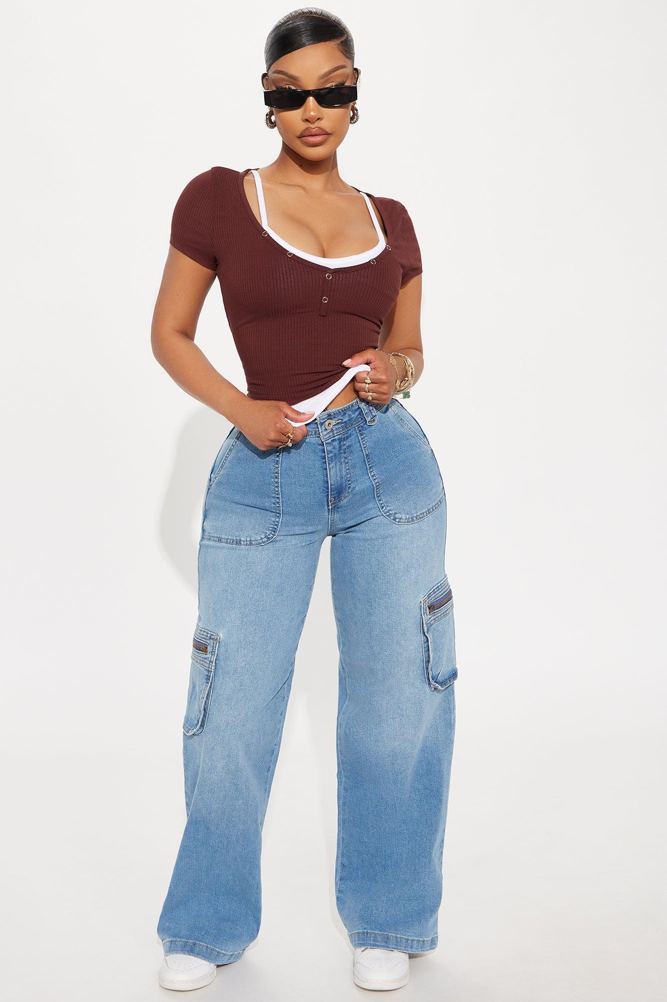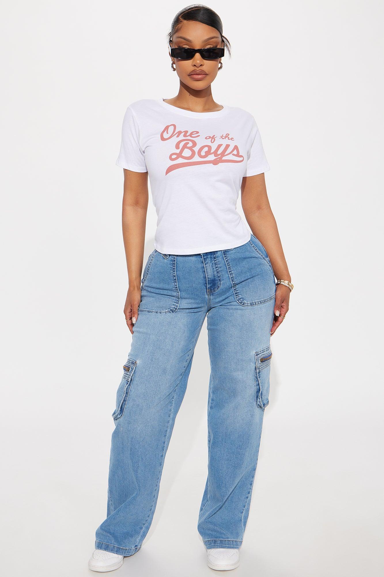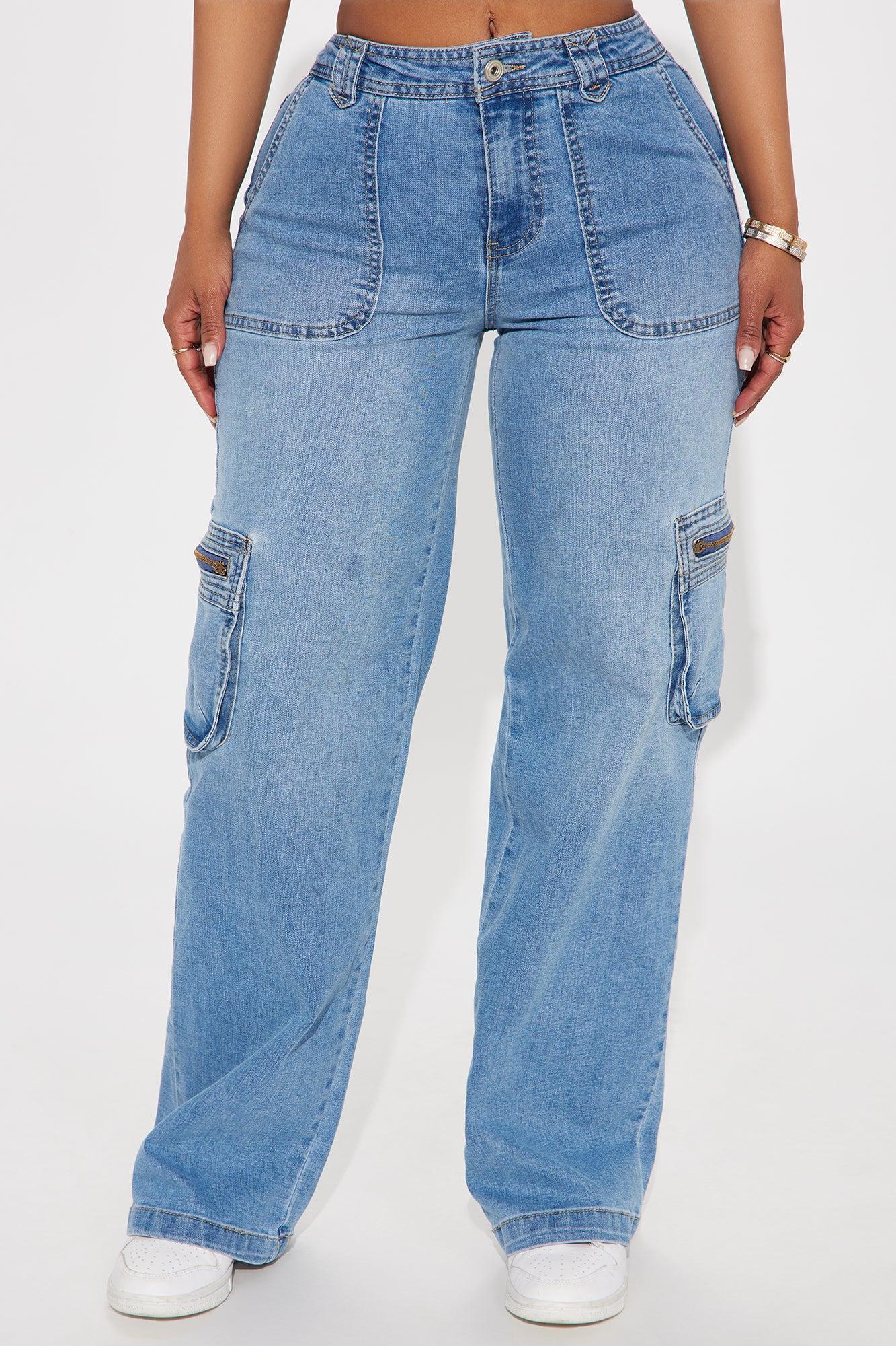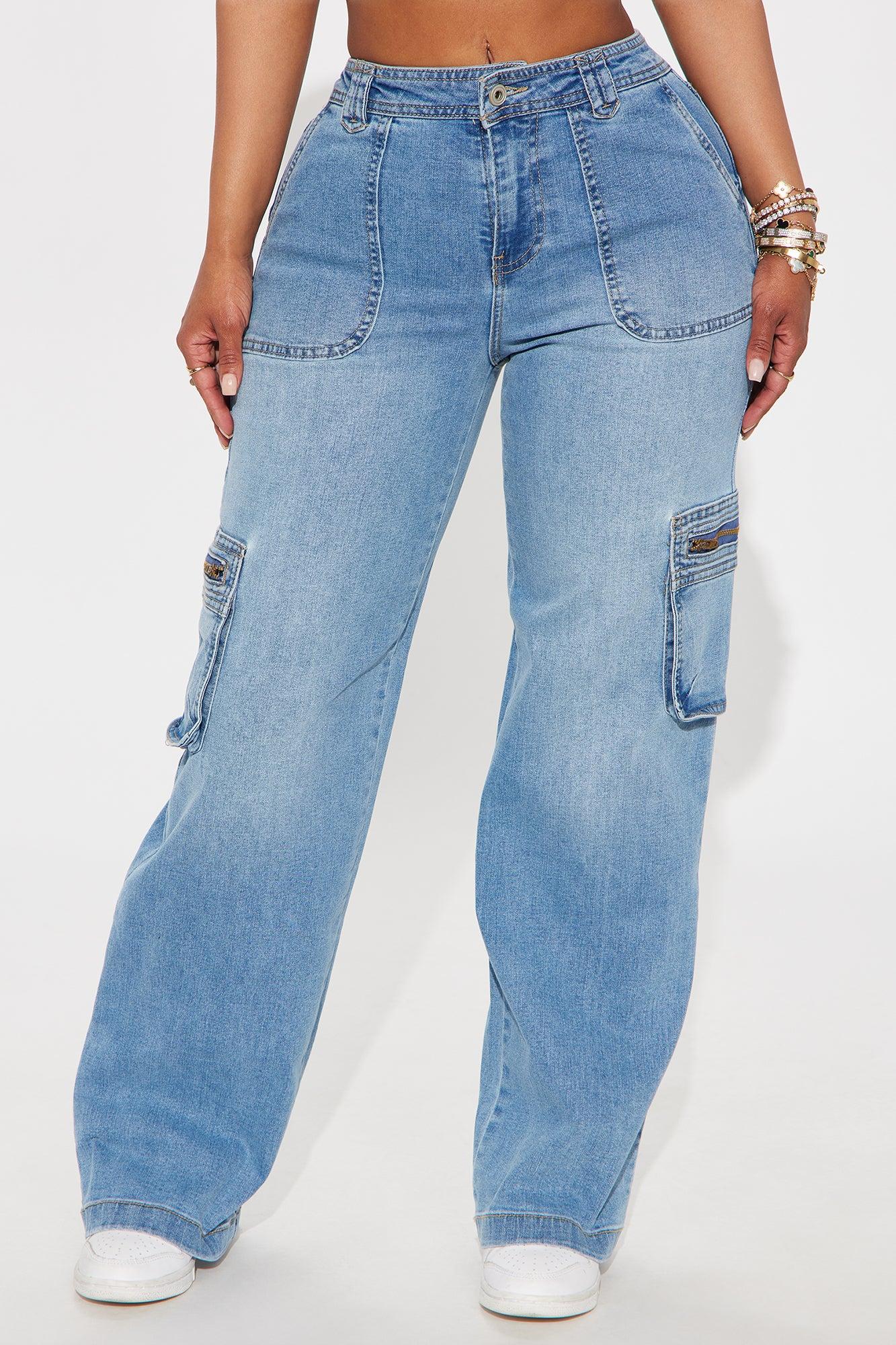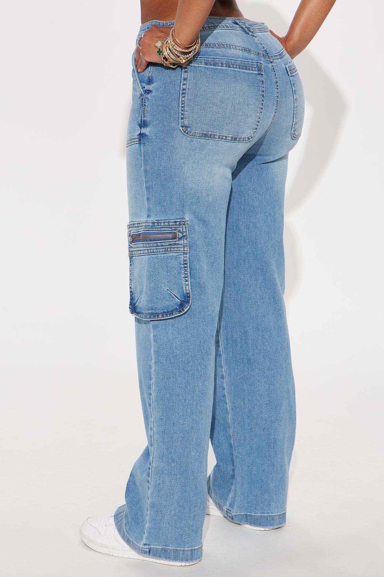 Available In Light Wash Wide Leg Cargo Pockets with Zippers Utility Detail 9.75" Rise 31" Inseam Medium Stretch Disclaimer: Due To The Specialized Distressing & Wash Process, Each Garment Is Unique 73% Cotton 24% Polyester 2% Rayon 1% Spandex Imported California Proposition 65WARNING: Cancer and Reproductive Harm - www.P65Warnings.ca.gov.