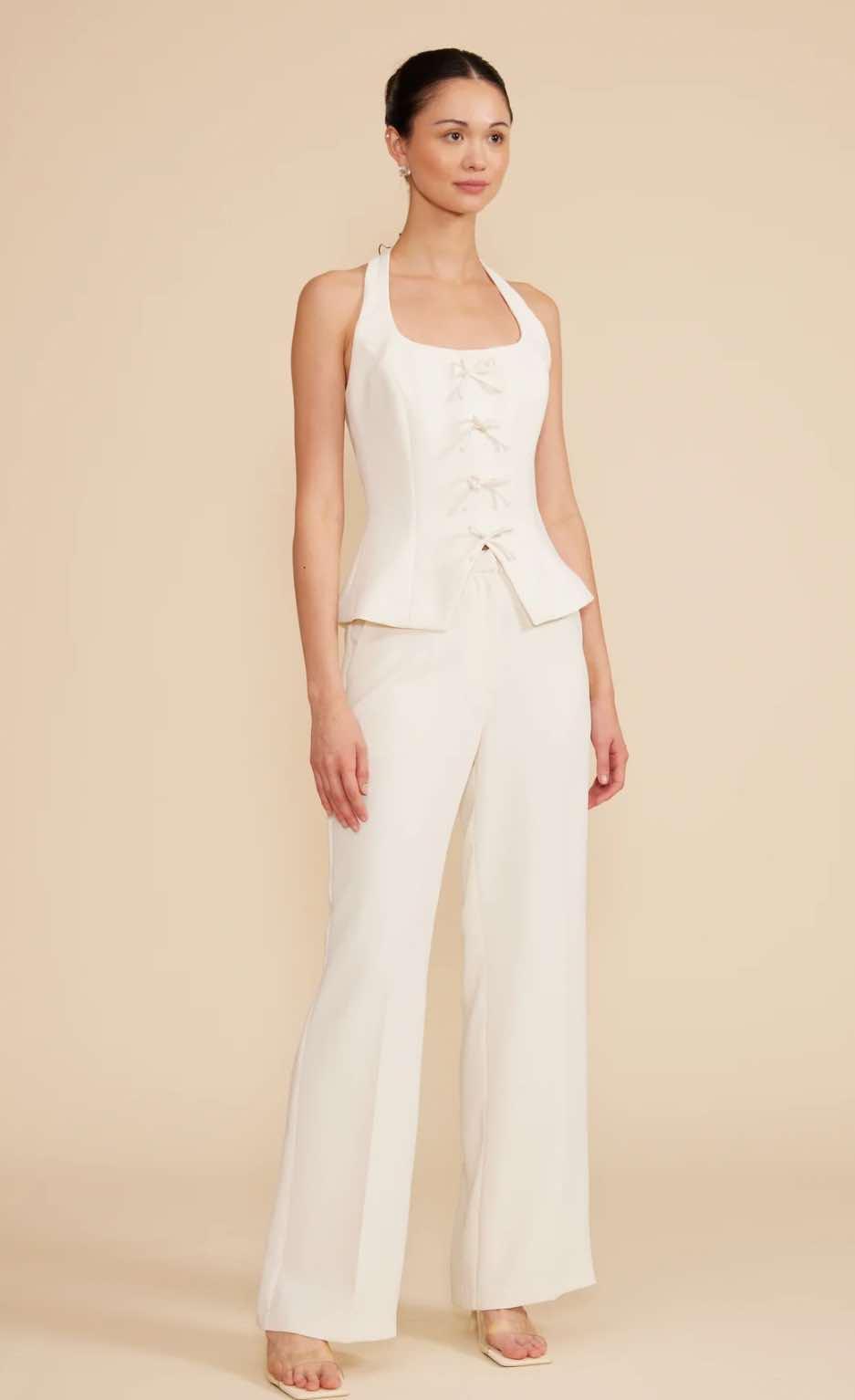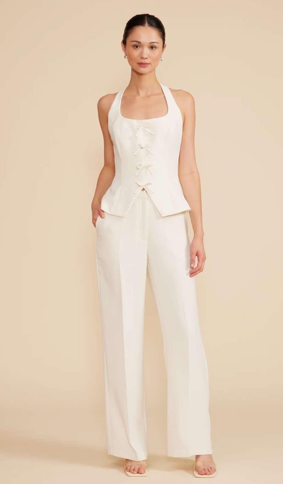 These pants are high-waisted, wide-leg trousers in a soft ivory or off-white color. They have a tailored fit with a smooth front, subtle pleating, and a structured yet flowy silhouette. The fabric appears to be lightweight with a slight sheen, giving them an elegant and polished look. They also feature side pockets and a crease down the front of each leg, enhancing their refined and sophisticated appeal. Perfect for both formal and semi-casual occasions, these pants can be styled with our Valli Halter Vest, or paired with other chic tops.