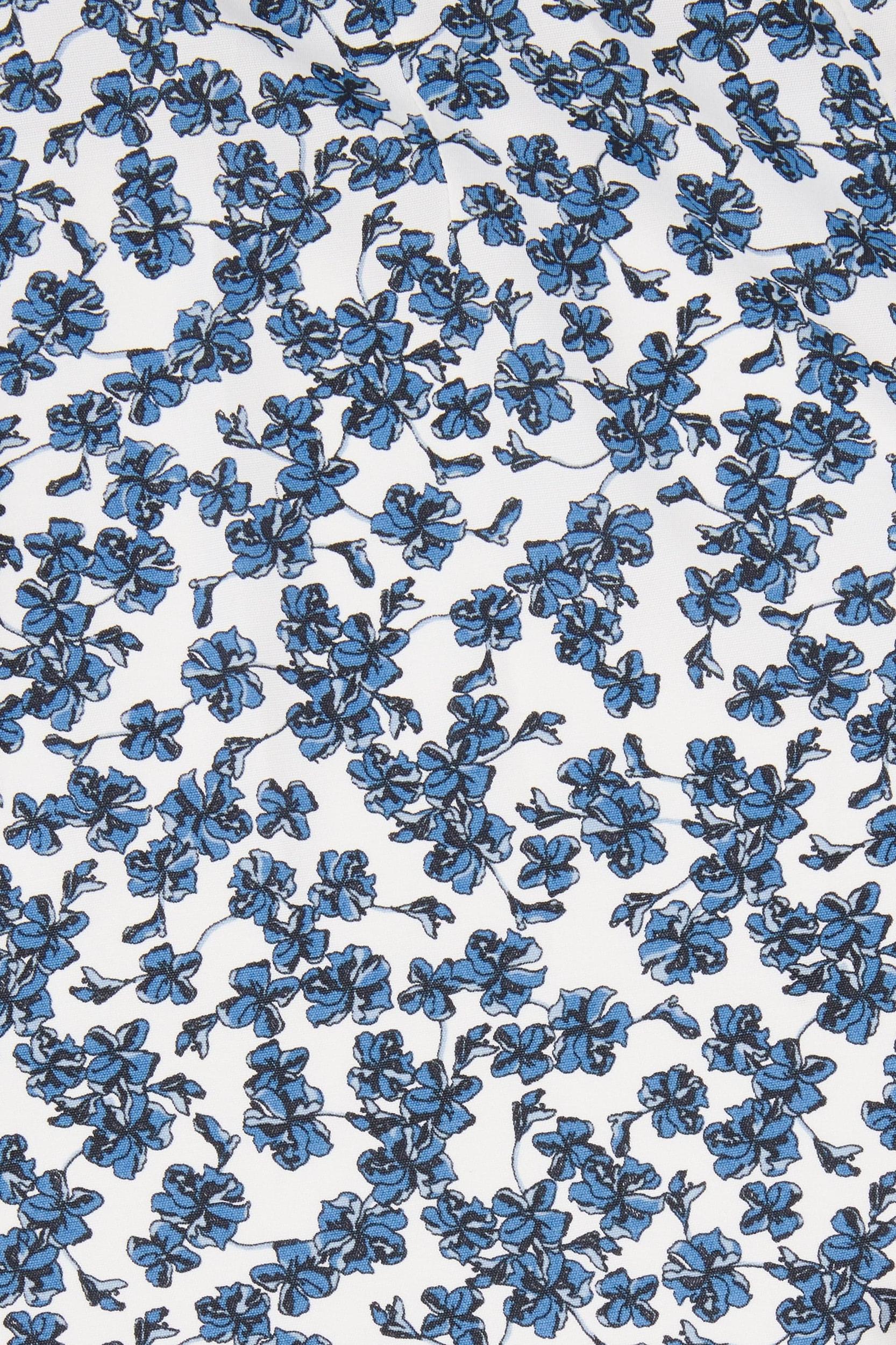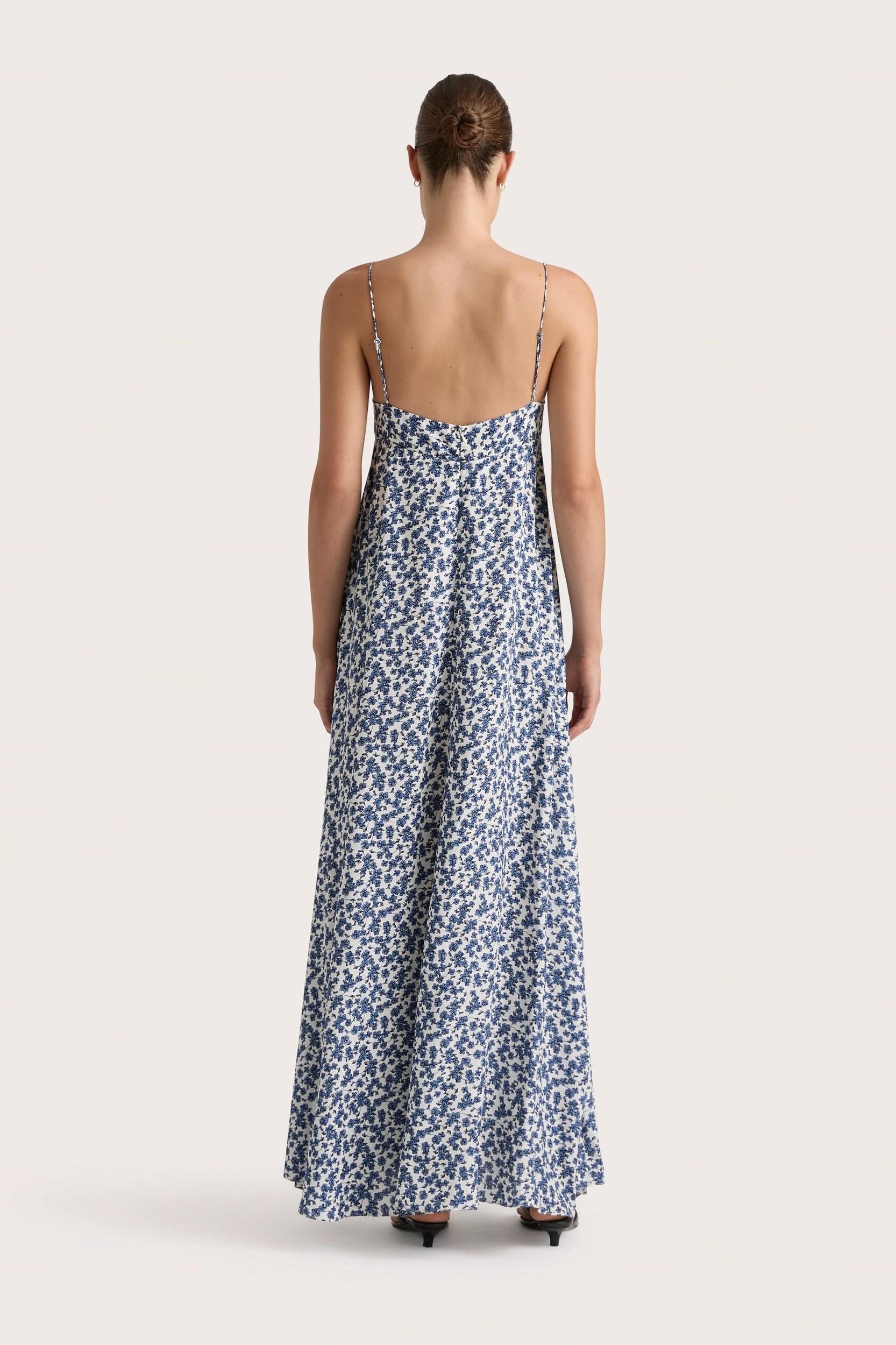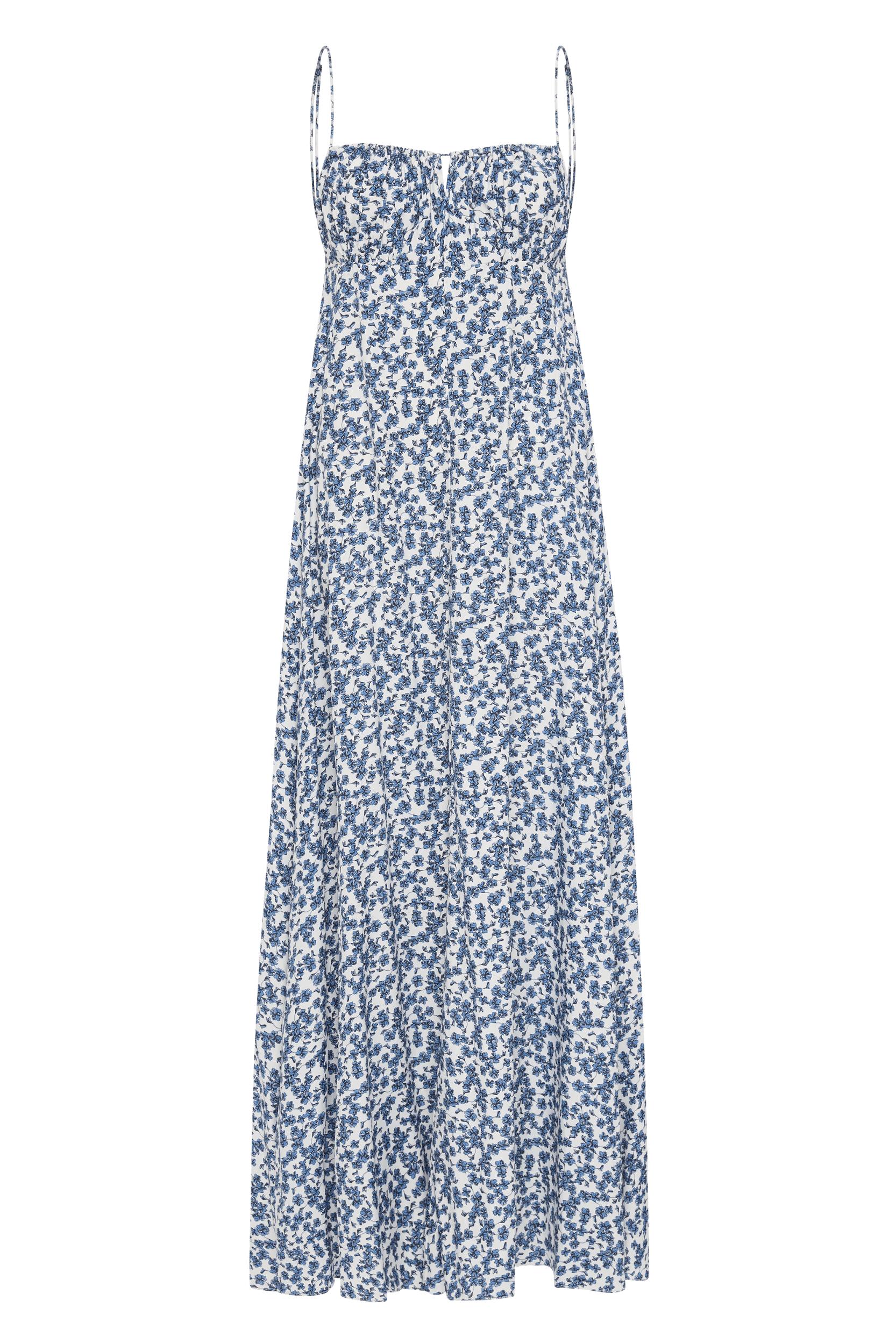 An ankle-grazing maxi dress, cut from a rayon crepe and imagined in a vintage-inspired mid blue floral. Thin straps, adjustable in length, lead to a gathered bust and tie detail, before falling into a soft A-line skirt. Style with a simple sandal for summer escapes.