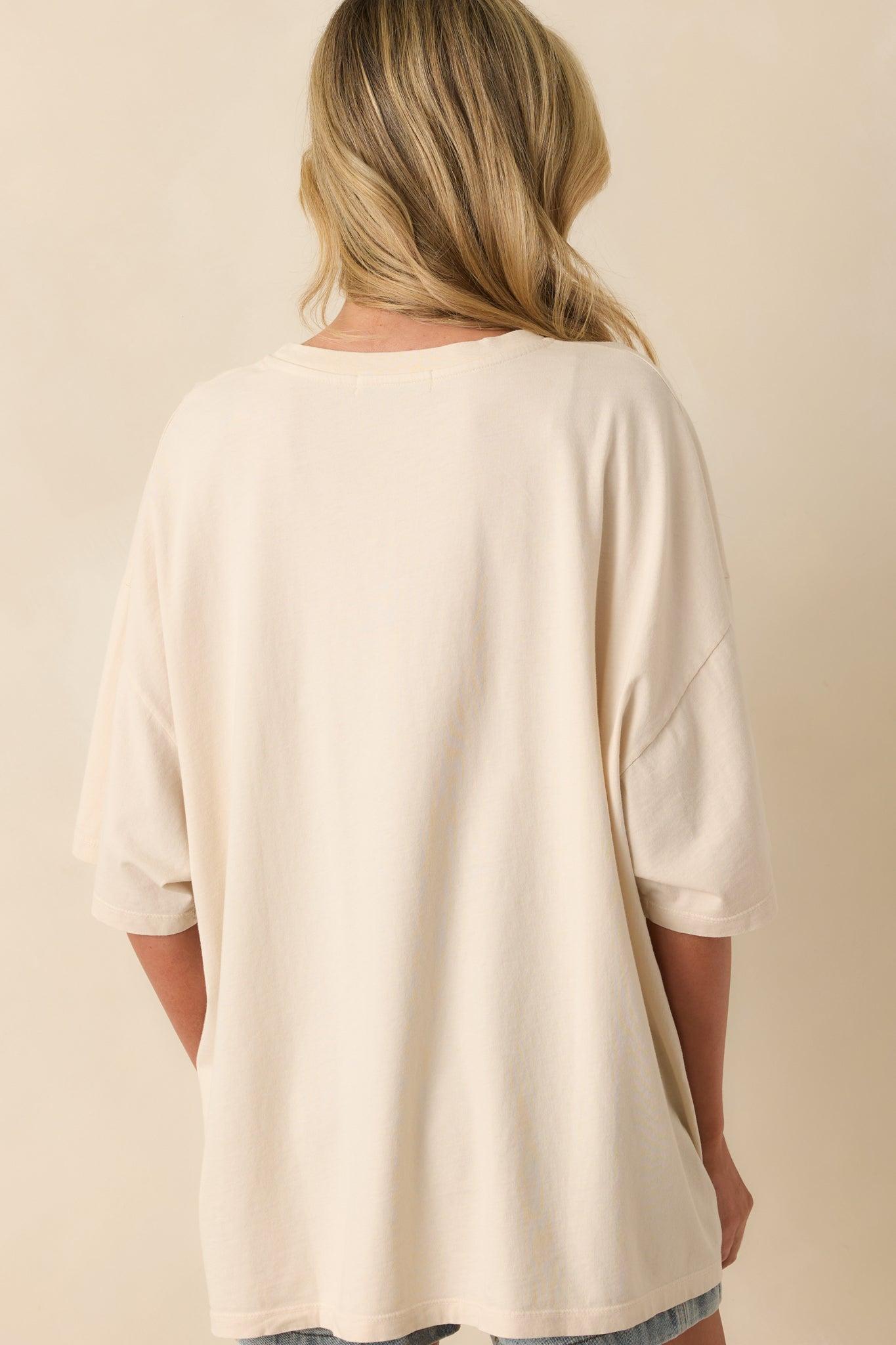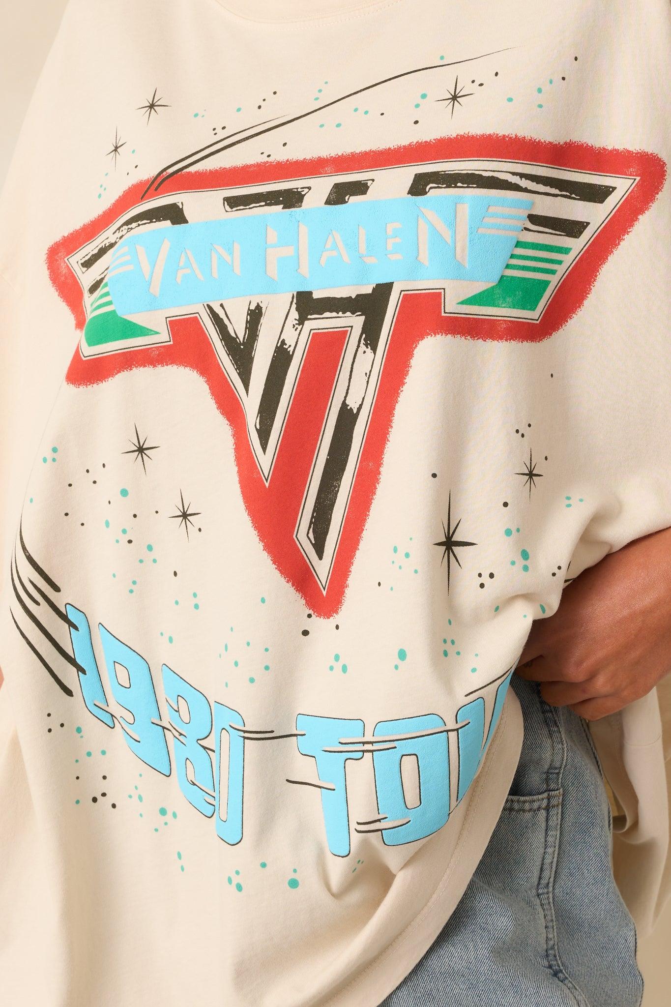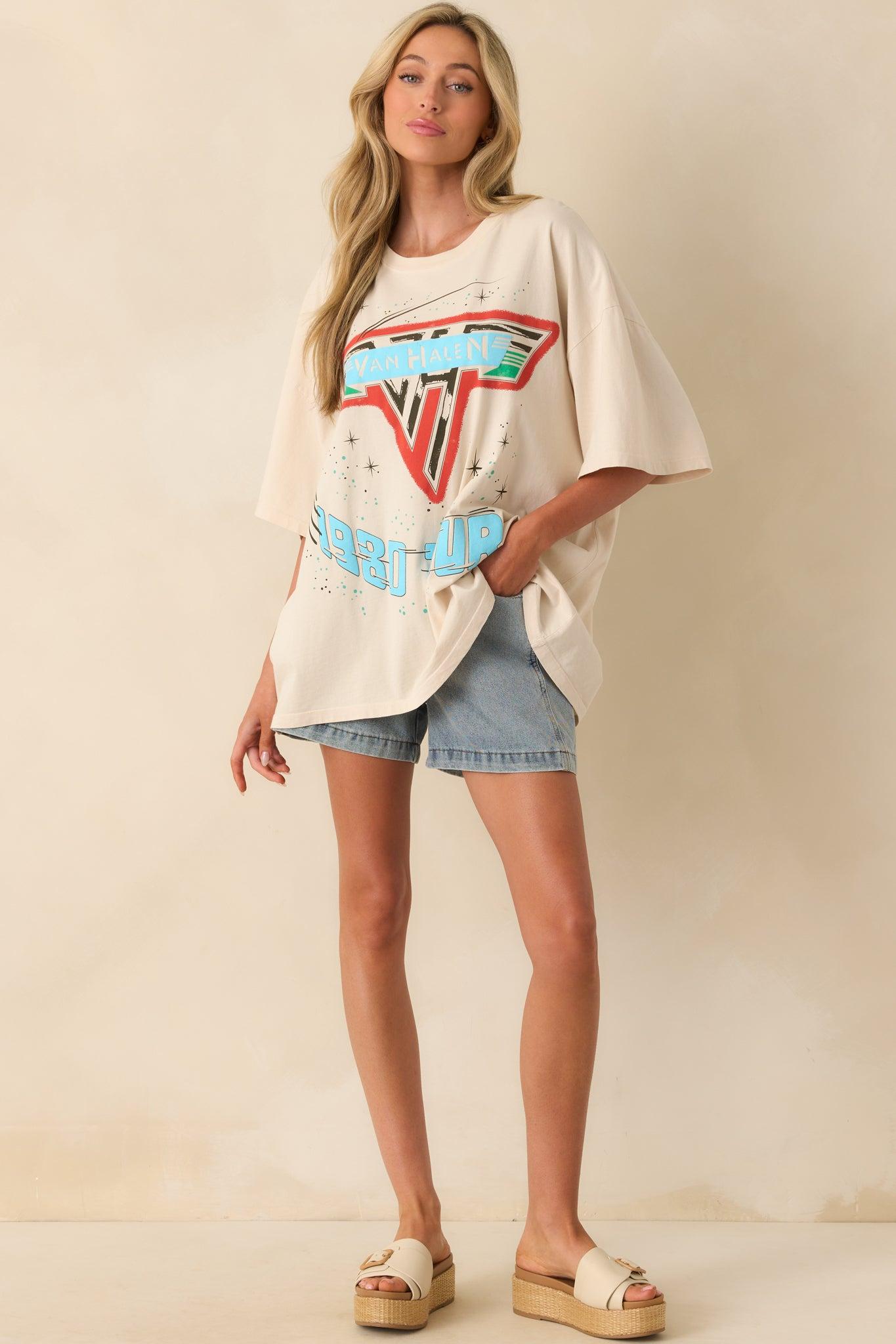Van Halen 1980 Tour Light Beige Cotton Oversized Tee channels rock-and-roll attitude with laid-back ease. Perfect for pairing with denim, layering under a jacket, or throwing on for casual days, it’s a tee that lets your love for legendary music shine through in effortless style. This light beige tee features a graphic paying homage to the Van Halen 1980 Tour with puff ink accents, a crew neckline, short sleeves, and an oversized fit.