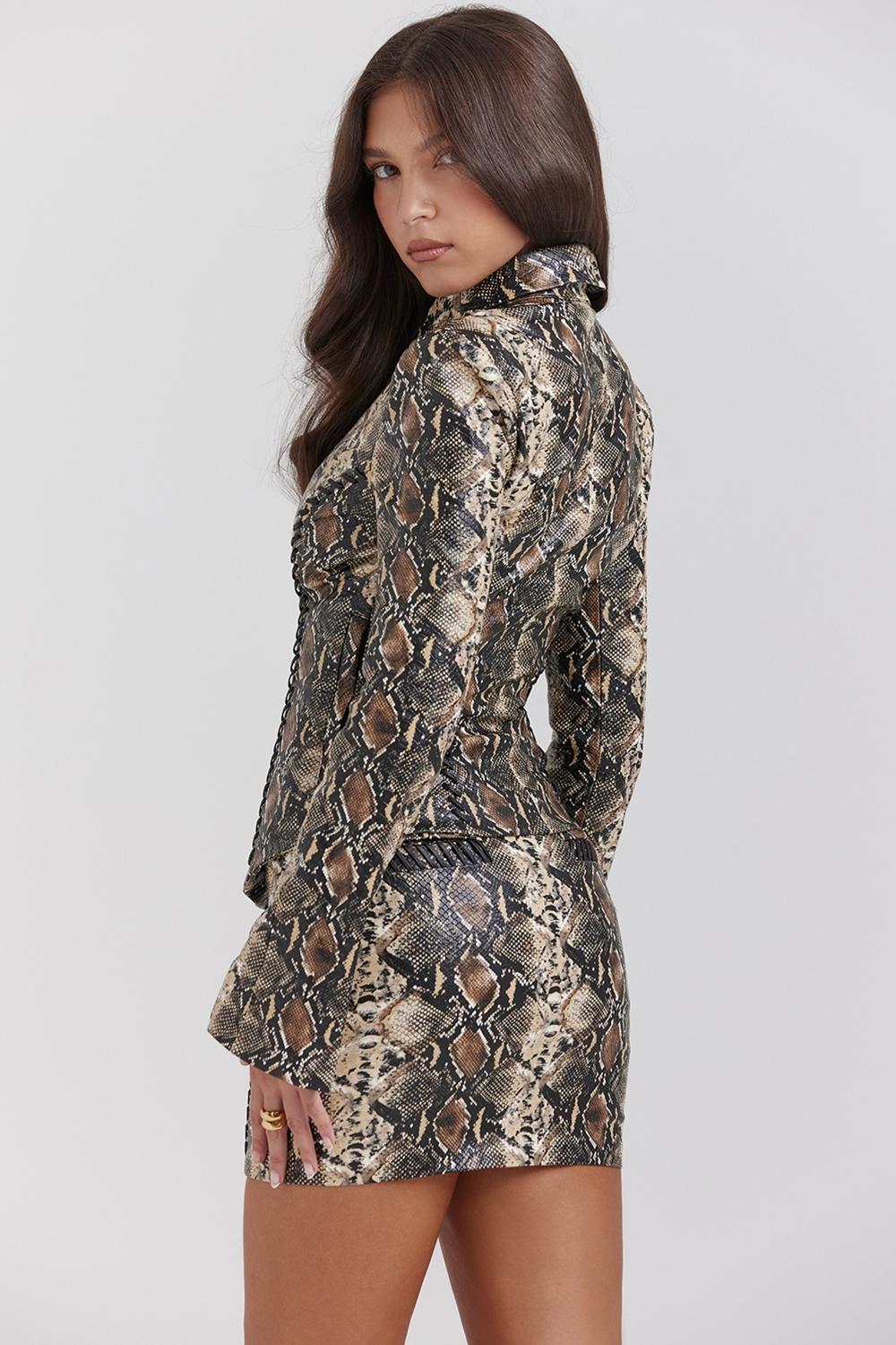 The bold snake print brings our 'Lena' mini skirt to life in the softest vegan leather. Sitting low on the waist, we love the stitched pockets to the back as it gently skims over your curves to hit mid thigh. It zips to the side for easy on. Wear yours with the matching 'Vani' snake print jacket and 'Paris' heels in black.