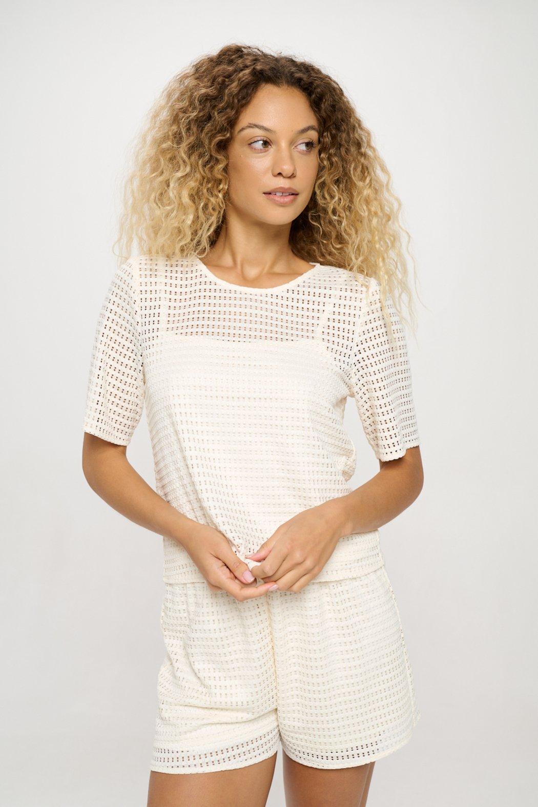 Stay effortlessly cool and casual in this textured knit top and shorts set, perfect for lounging or resort-ready days. Featuring an open weave eyelet-inspired fabric, this matching set is both lightweight and breathable. The relaxed short-sleeve top pairs perfectly with easy pull-on shorts featuring an elastic waistband for all-day comfort. Ideal for layering over swimwear or worn as a chic set, this outfit is a must-have for vacation, weekend brunch, or laid-back summer days