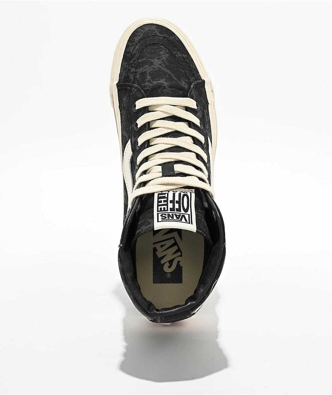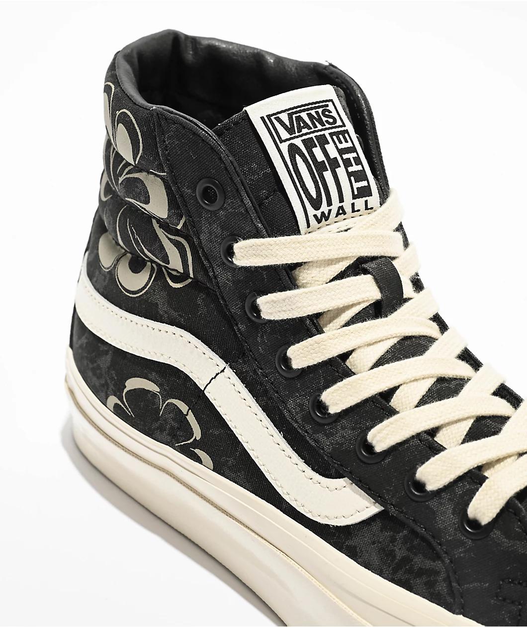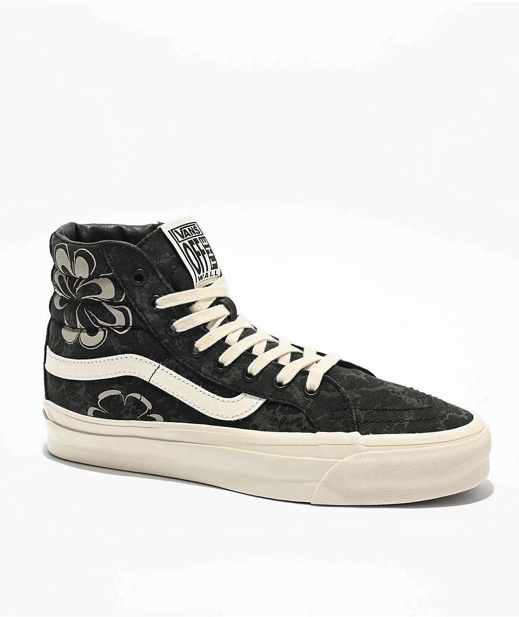 The folks at Vans welcome the MTE Sk8-Hi reissue 38 skate shoes in a "Stain Abyss" vintage black colorway adorned with Floral print accents. These Sk8-Hi's have white leather Sidestripes™ on the canvas sidewalls adorned with a classic "Off The
