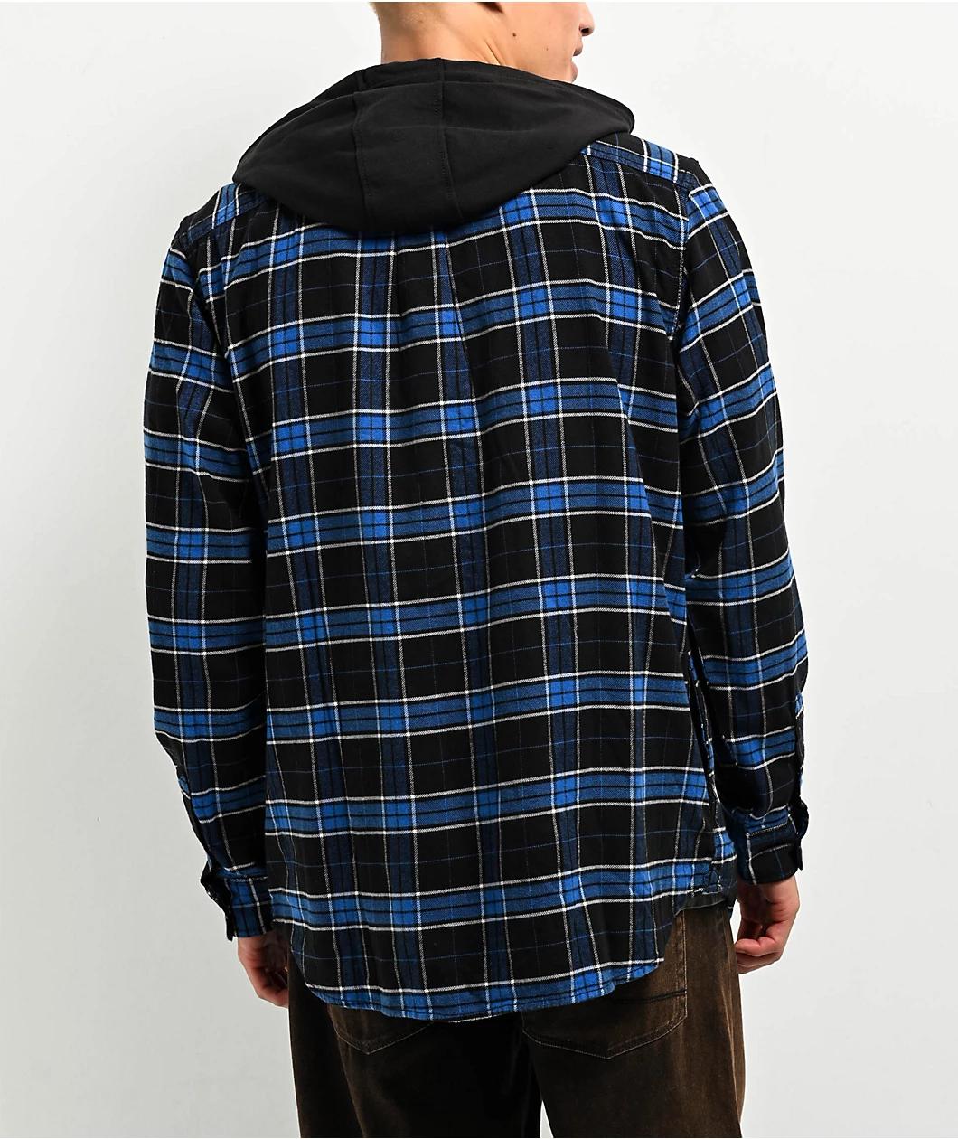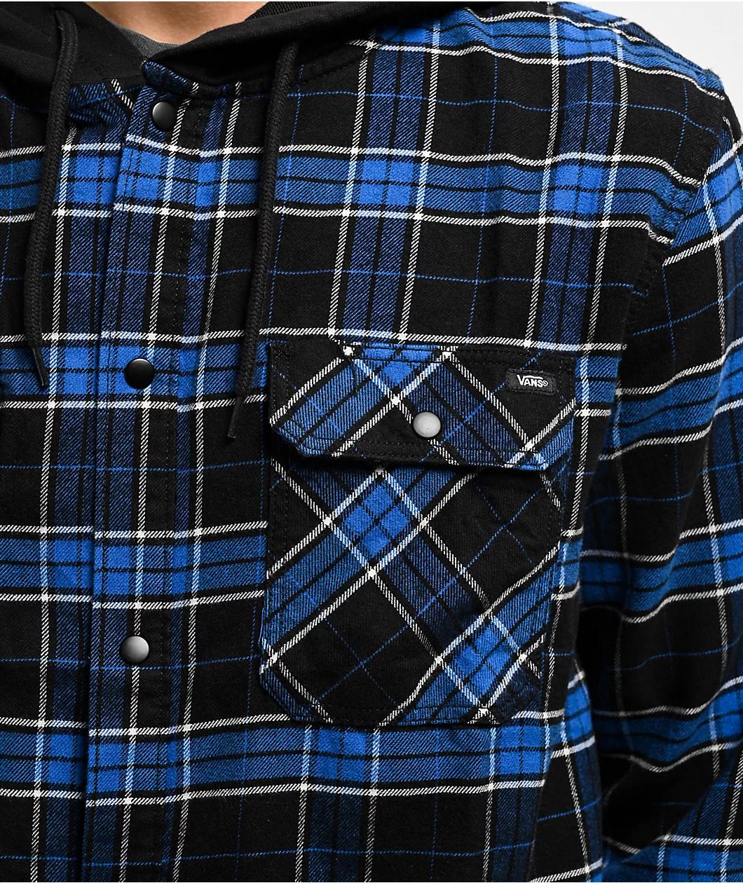 Vans presents the Parkway II hooded flannel shirt in a "Black-True and Blue" colorway. This long sleeve delivers a vintage look with the all-over plaid pattern and a woven brand tag on the left chest pocket. This flannel has an adjustable drawstring