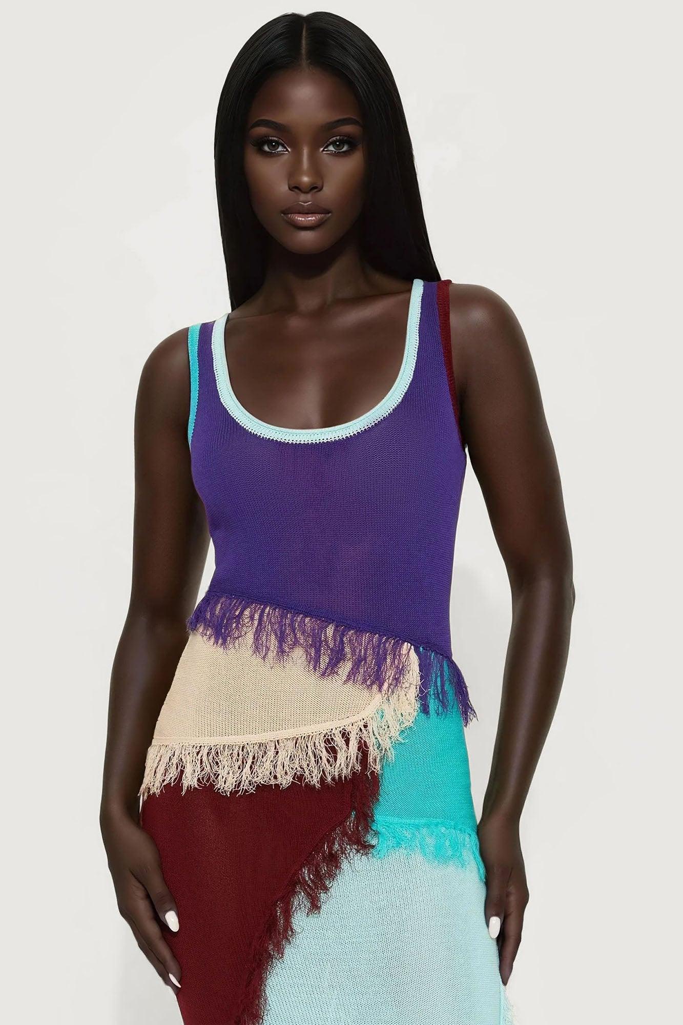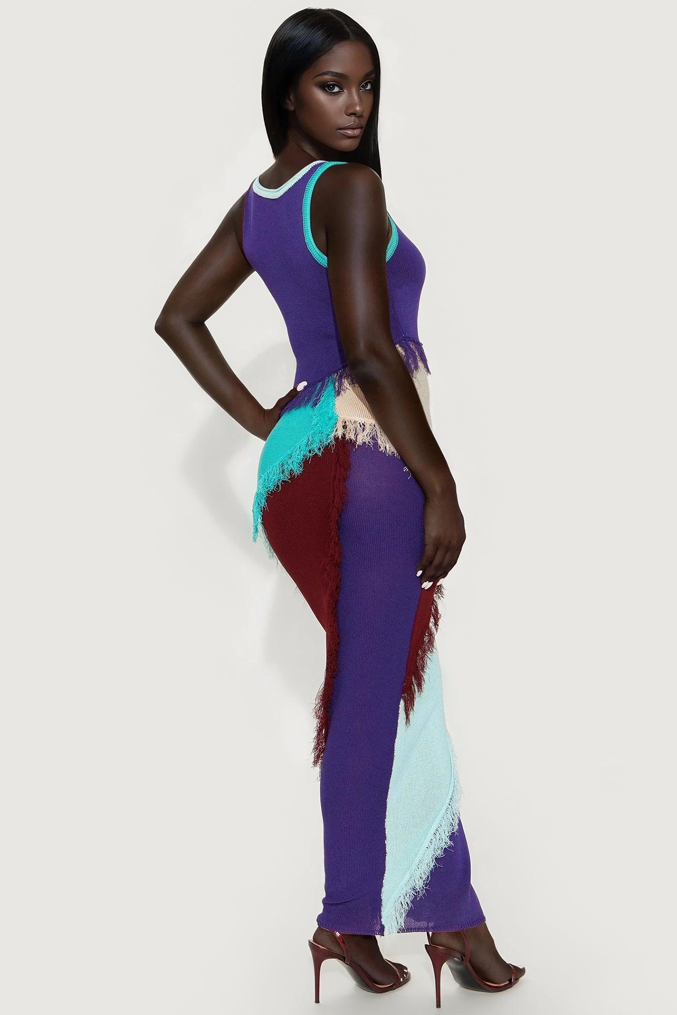 Available In Purple/combo. Sweater Maxi Dress Sleeveless Scoop Neckline Color Block w/ Fringe Detail Stretch 88% Viscose 12% Nylon Imported