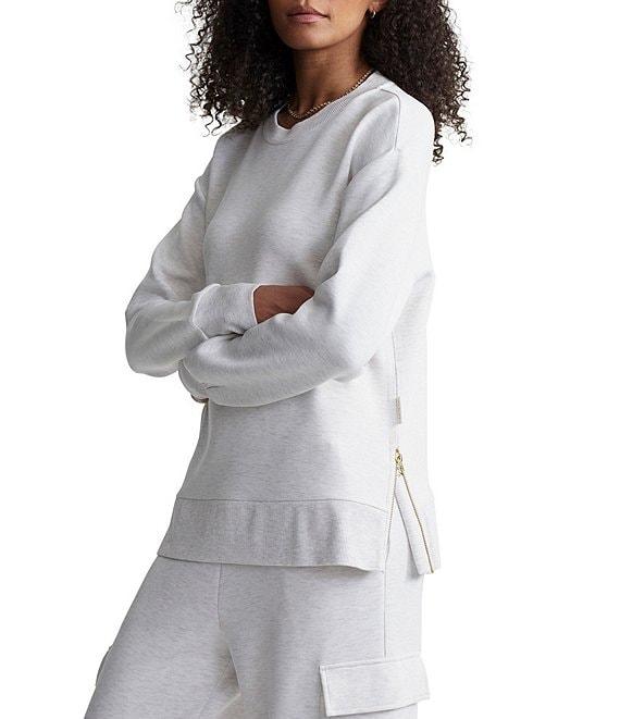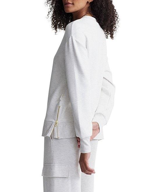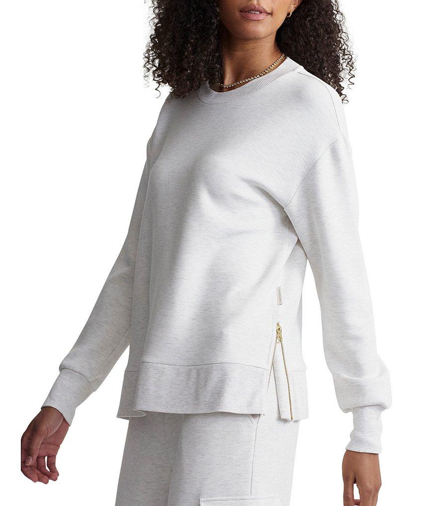 From Varley, this sweatshirt features: DoubleSoft® Knit Fabrication Ribbed Crew Neckline Long Sleeves Dropped Shoulders Soft & Lightweight Locks in Warmth Oversized Fit Mid Length Straight Hemline Side Seam Gold Metal Hardware Zipper Pullover Construction Approx. 25.6" in Length Approx. 22.2" Sleeve Length Viscose/Polyester/Spandex Turn garment inside out prior to wash, machine wash on cool, do not bleach, wash with similar colors, remove promptly from washer, dry flat, iron on cool if needed. Imported.