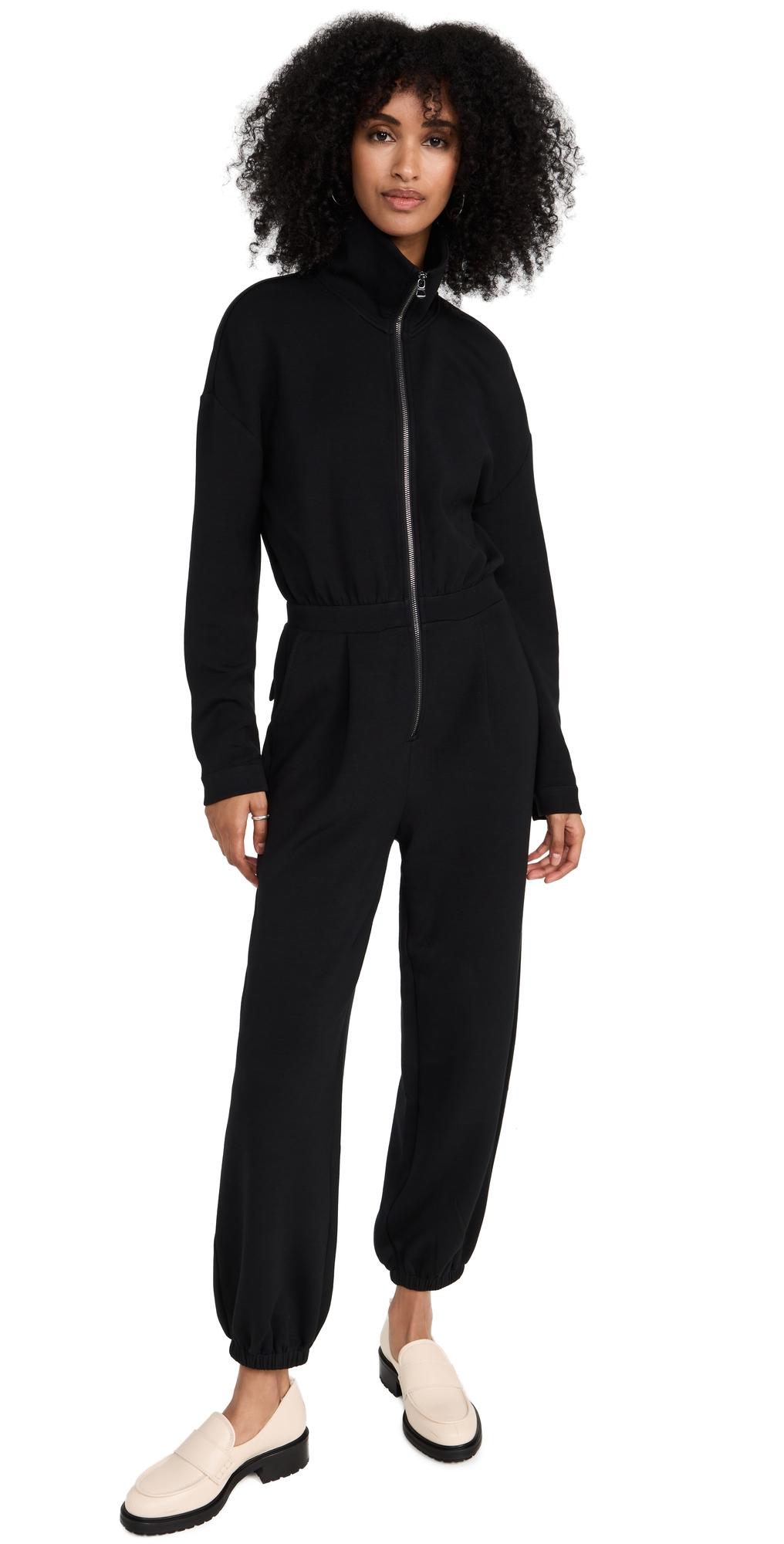 Varley Jessie jumpsuit cut in signaturesoft and luxurious double-faced jersey Spread collar; front zip Dropped shoulders Long sleeves; snap cuffs Elasticized waistband Side slant pockets; back flappocket Relaxed legs Elastic cuffs Viscose/polyester/elastane Imported