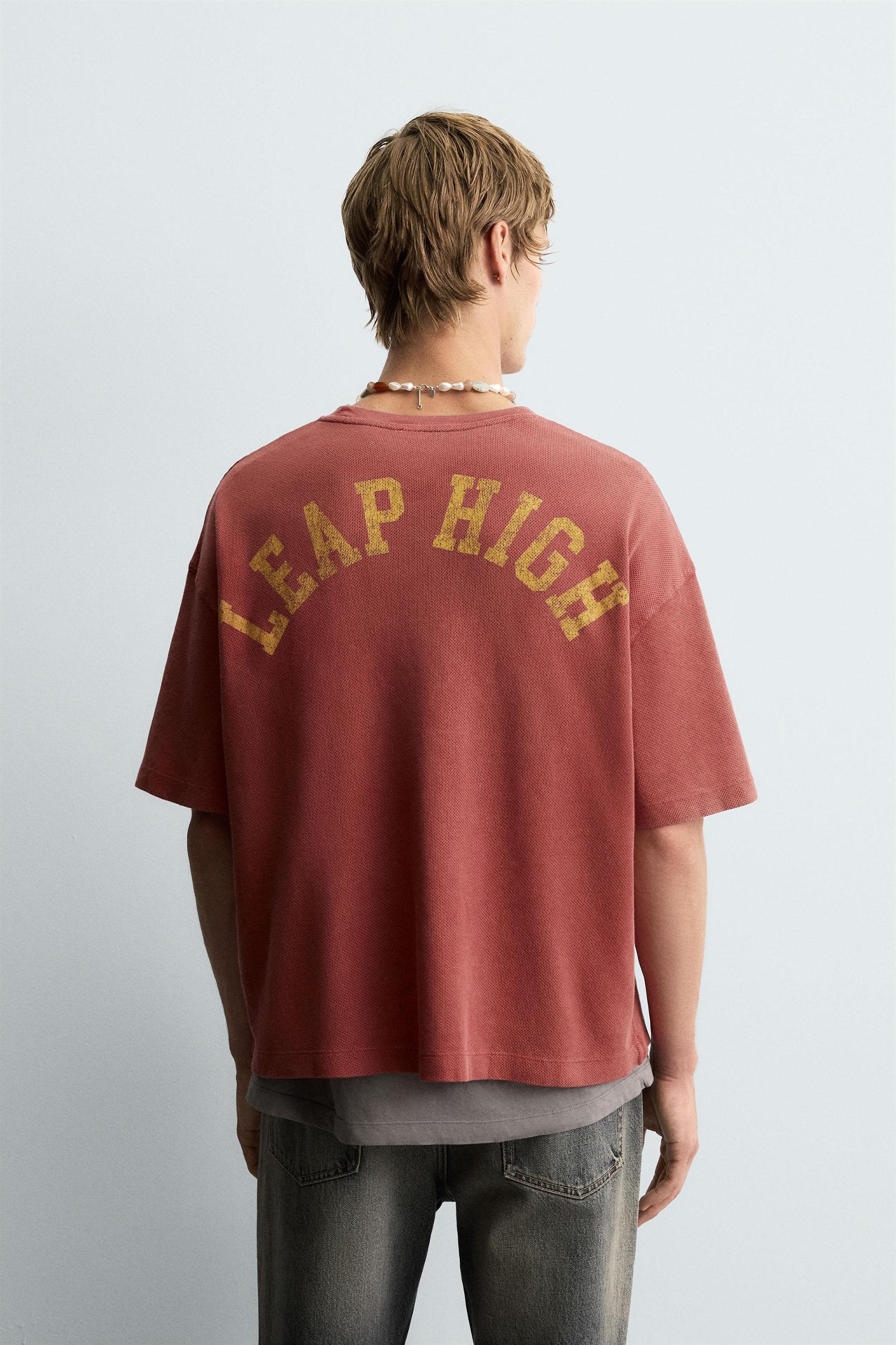 Relaxed fit T-shirt made of open weave fabric. Round neck and short sleeves. Washed effect print on the front and sleeves.