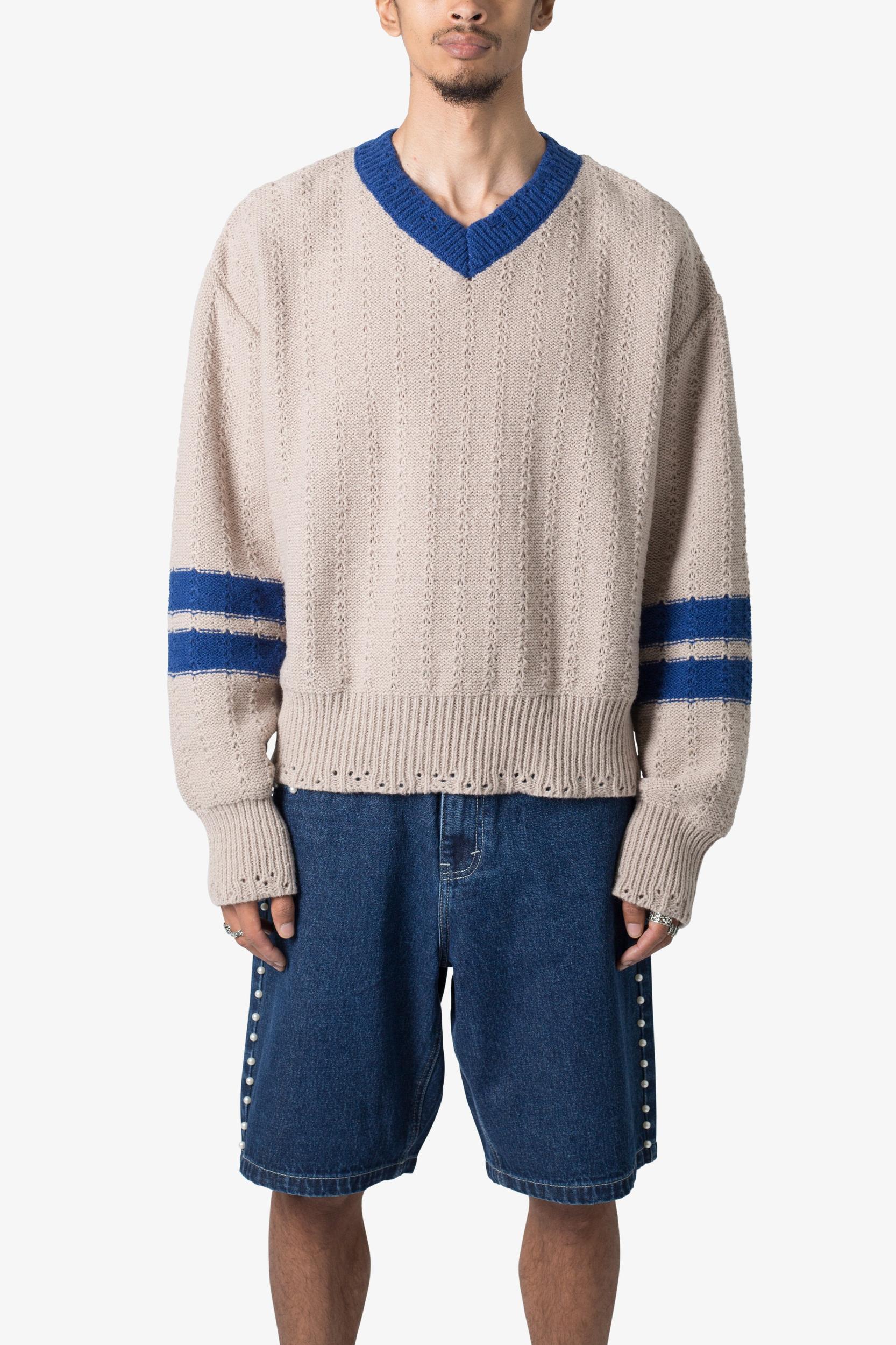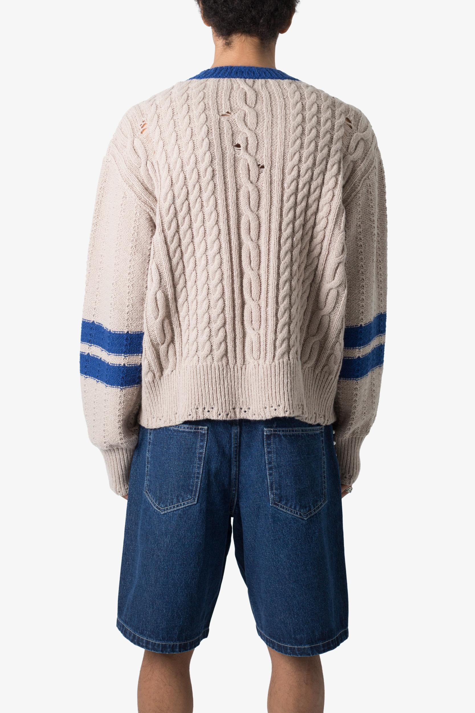 the Varsity V Neck Sweater is a custom knit sweater that is constructed from a cotton yarn, multi color stripe details at the collar and arms, cable knit detail on the back, features a relaxed fit, and is finished with reverse facing fabric on the front and wrists. details relaxed fit 100% cotton model is 6’1, 140 lbs