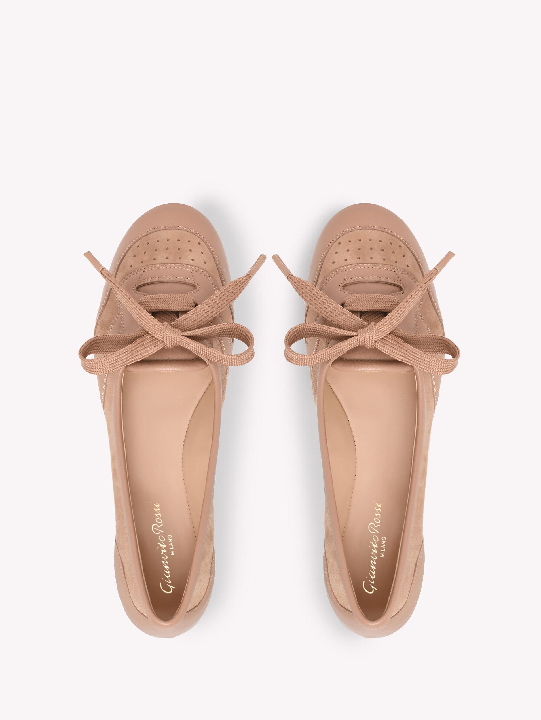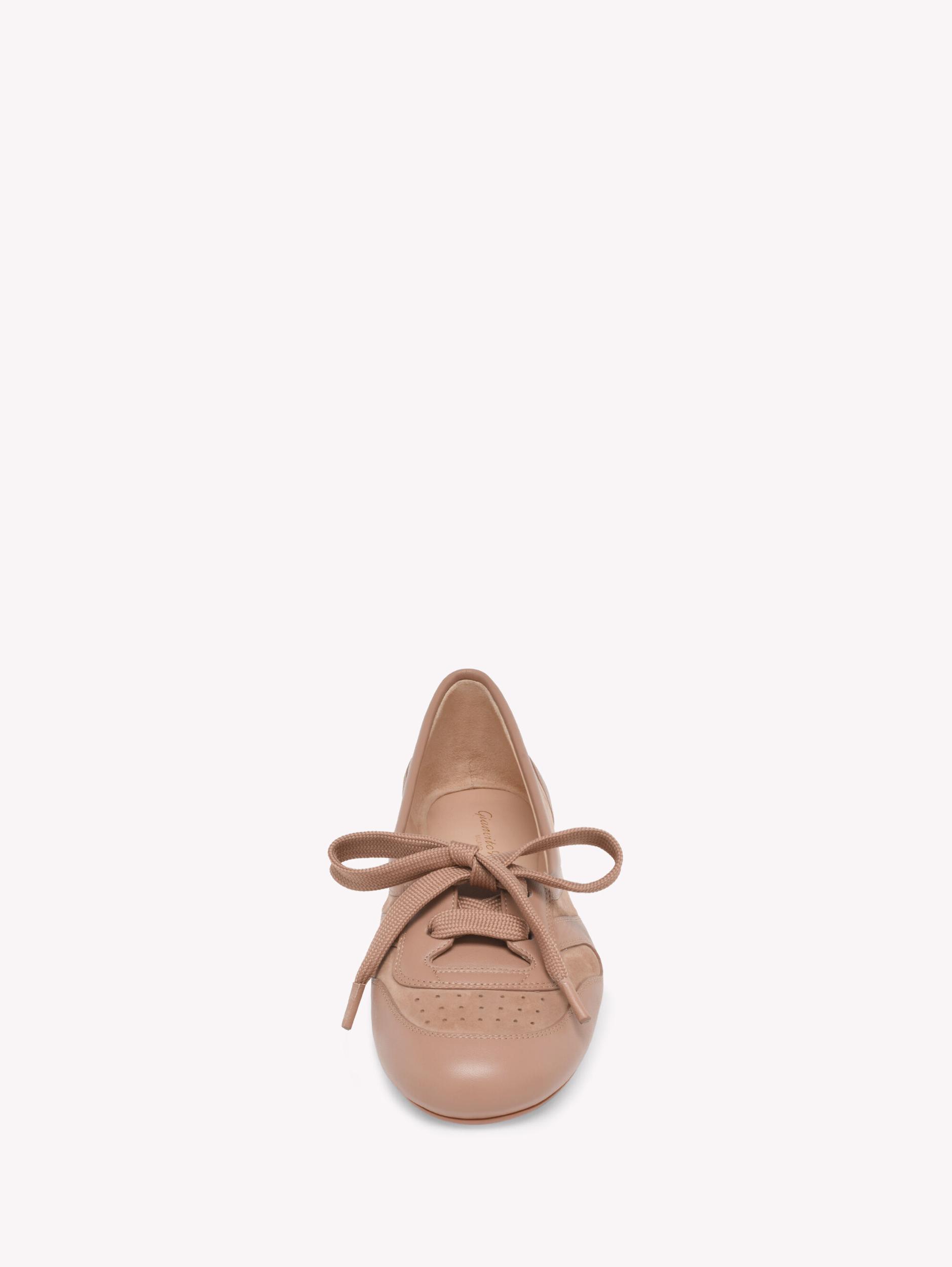 Crafted from leather and suede, Vault is a round toe flat sneaker ballerina style with tonal laces and a rubber sole. Handmade in Italy.