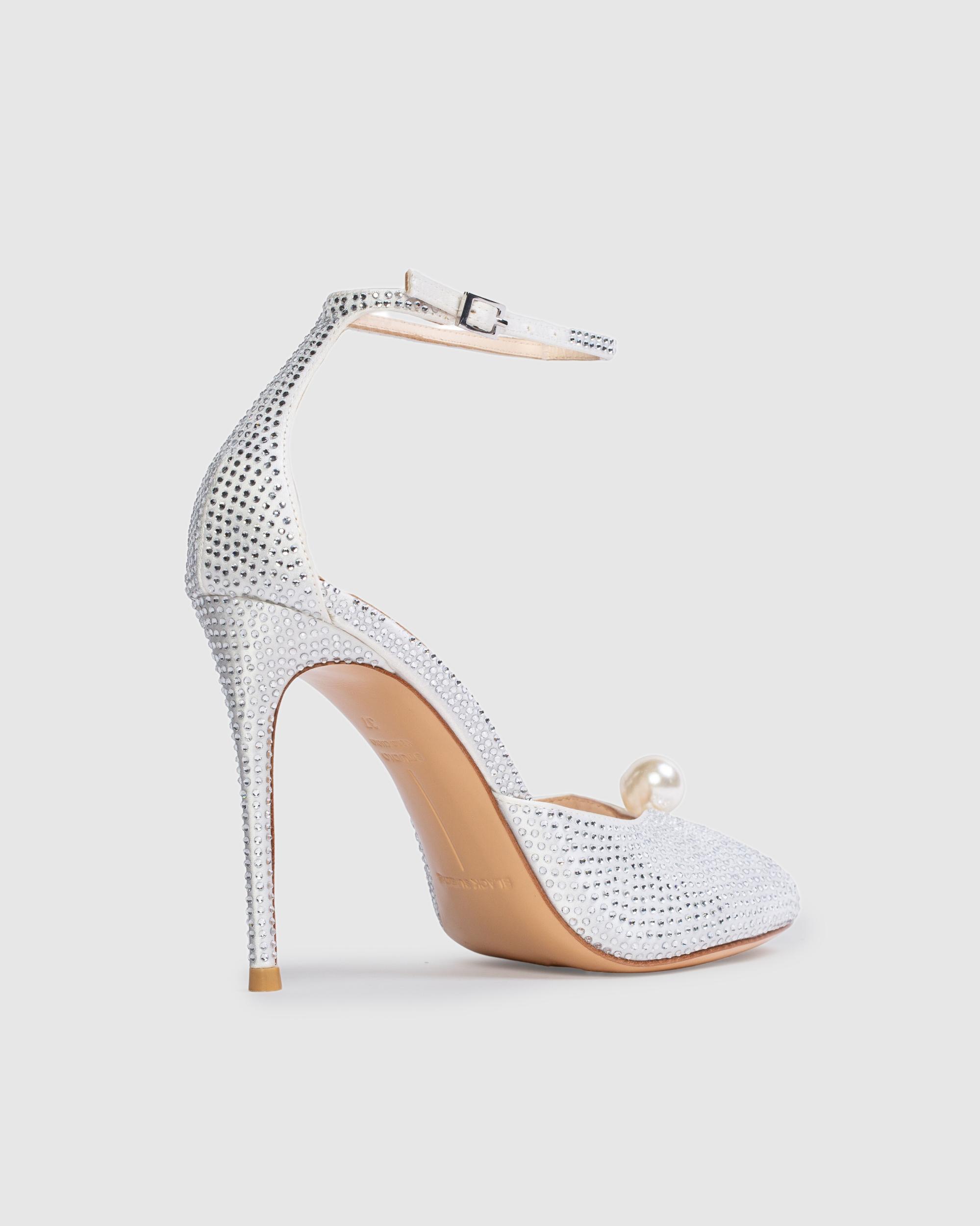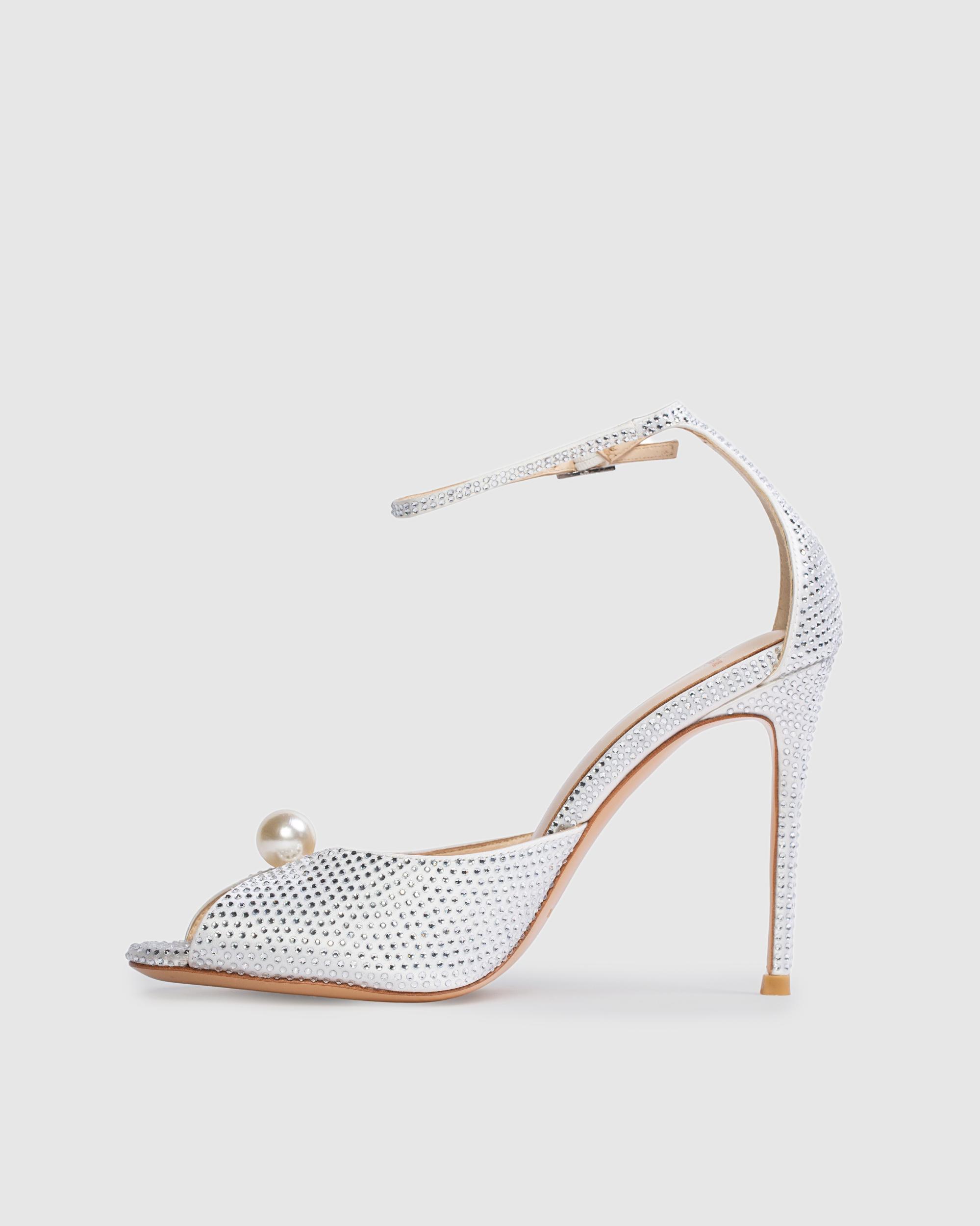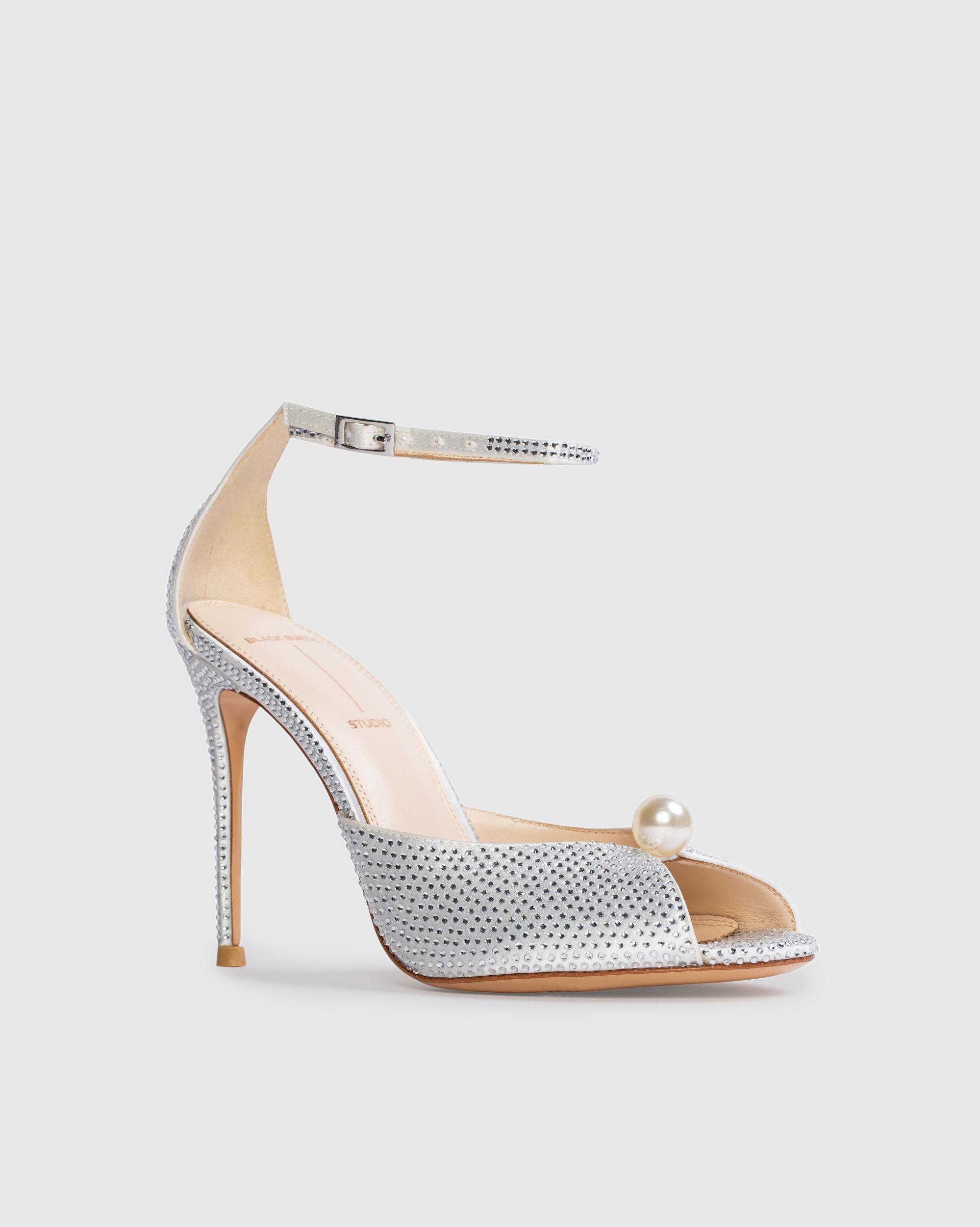 Round toe embellished sandal with pearl detailing, set on a stiletto pin heel. Made with satin crepe.