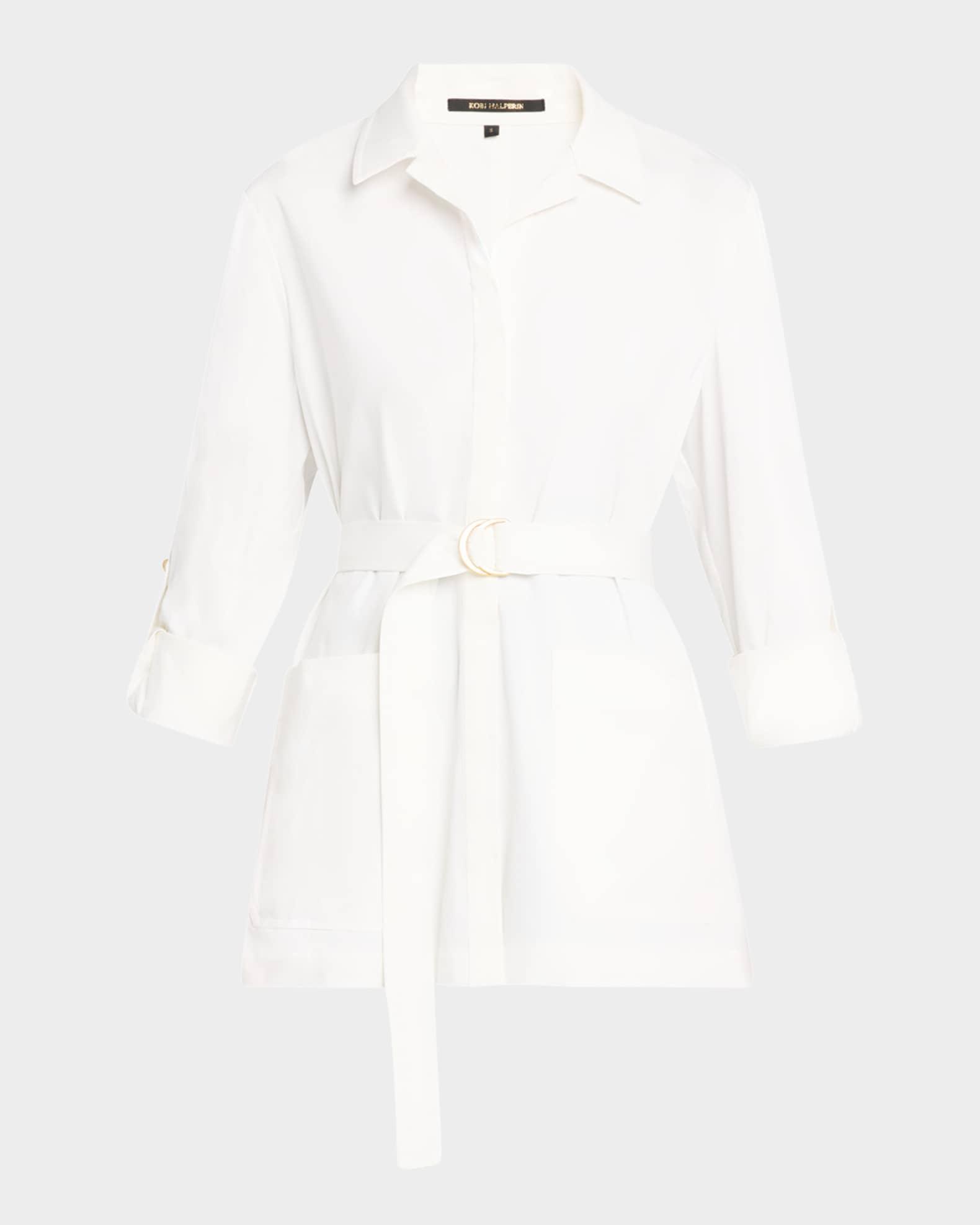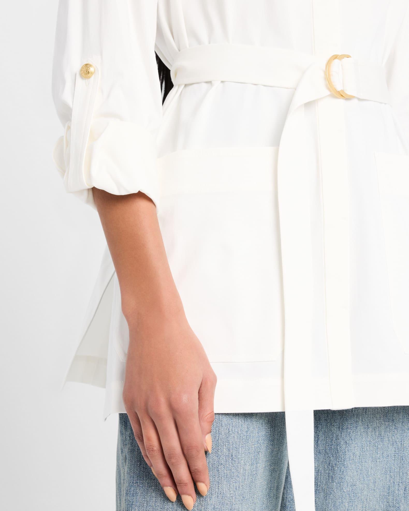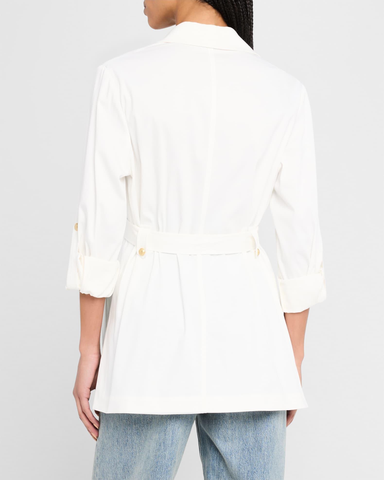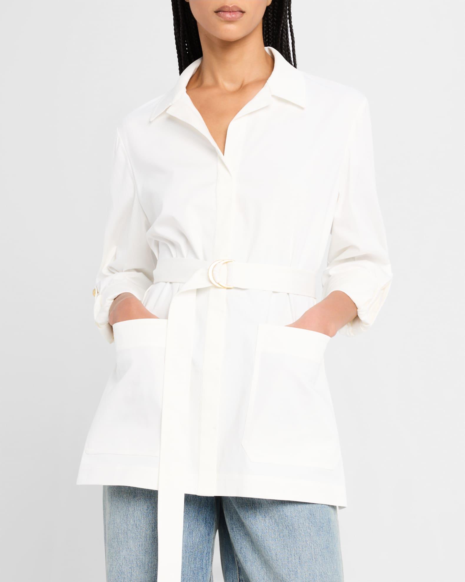 Kobi Halperin "Veda" jacket with matching D-ring belt Approx. 29.5"L from shoulders to hem Spread collar; concealed button front Long roll-tab sleeves Front patch pockets Tailored fit Cotton Lining: Polyester Dry clean Imported Shipping Direct from Vendor, usually ships within 7 business days.