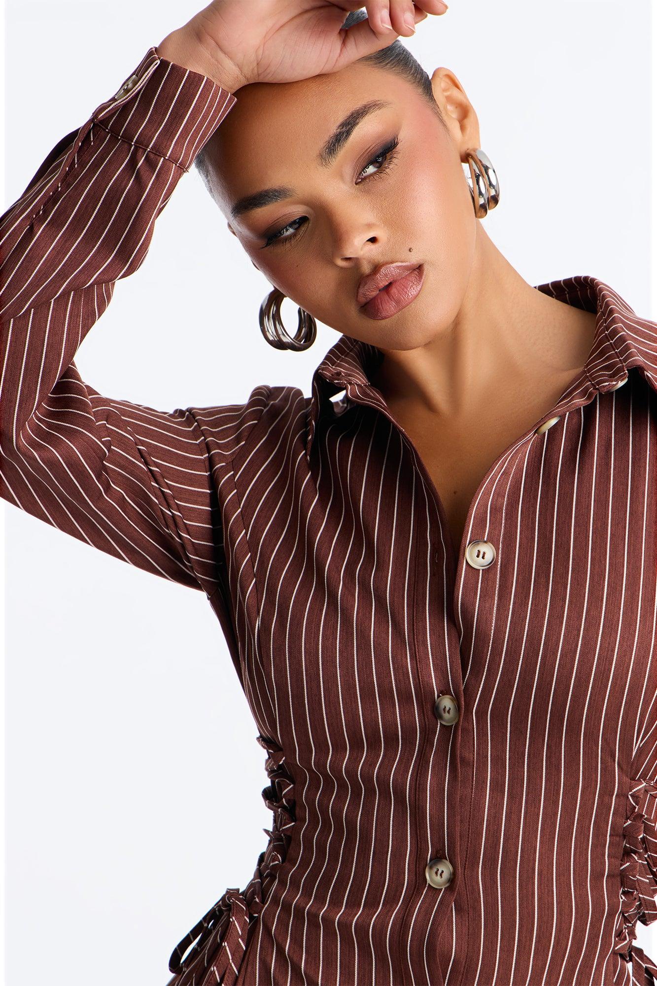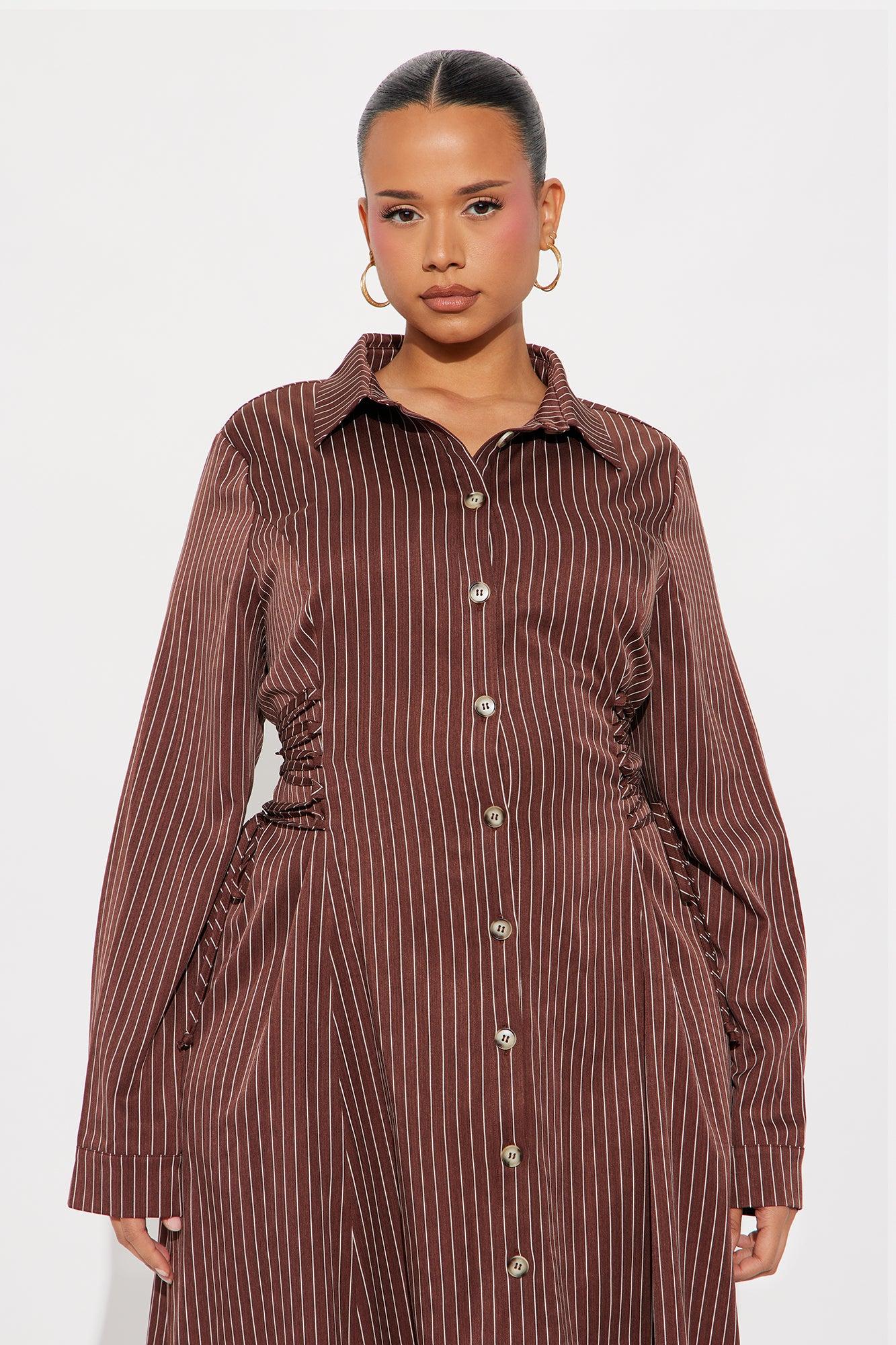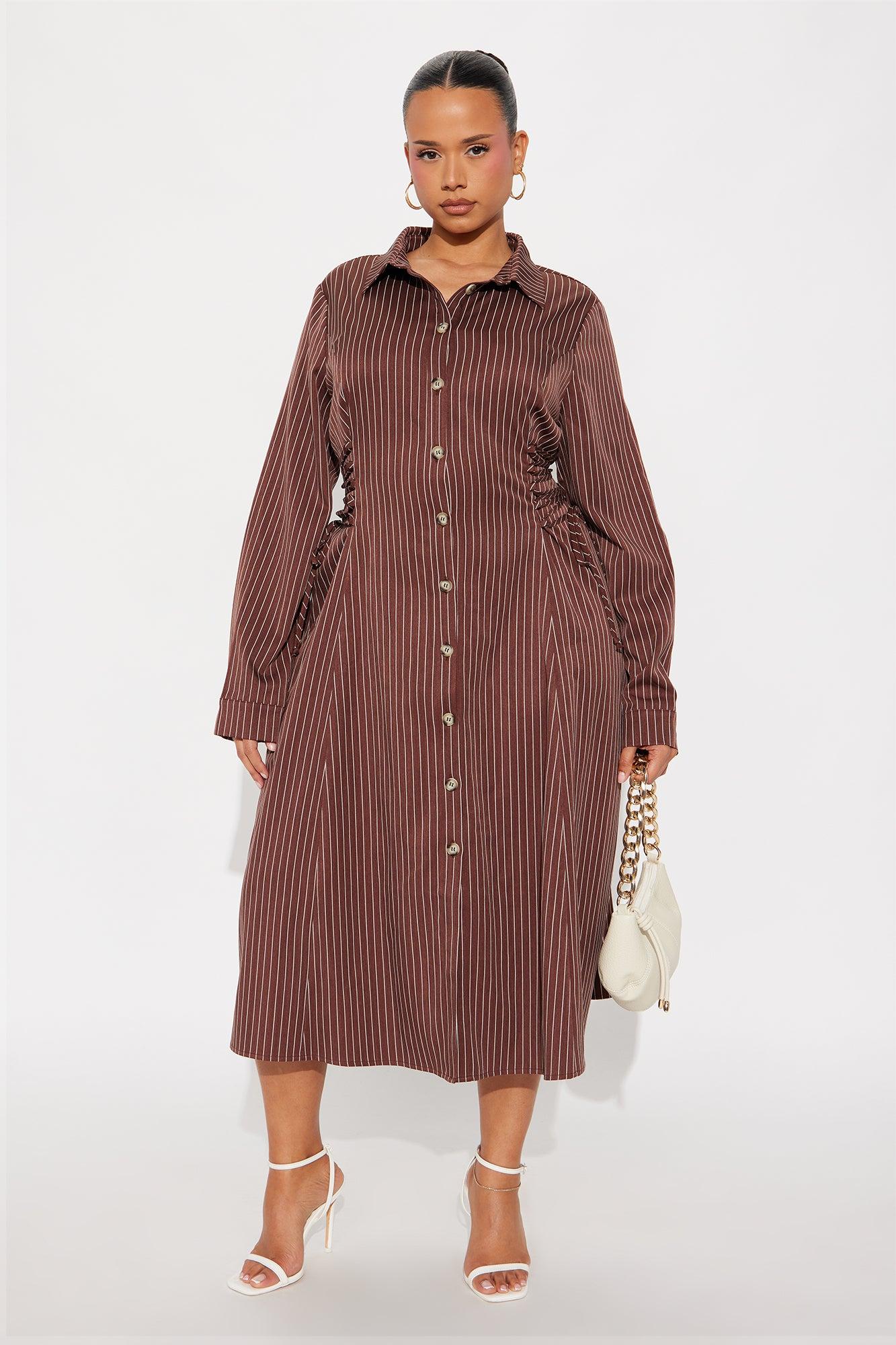 Available In Chocolate/Combo And Olive/combo. Pinstripe Shirt Midi Dress Collar Long Sleeve Button Up Lace Up Sides Non Stretch Length Measured Flat = 42" 100% Polyester Imported
