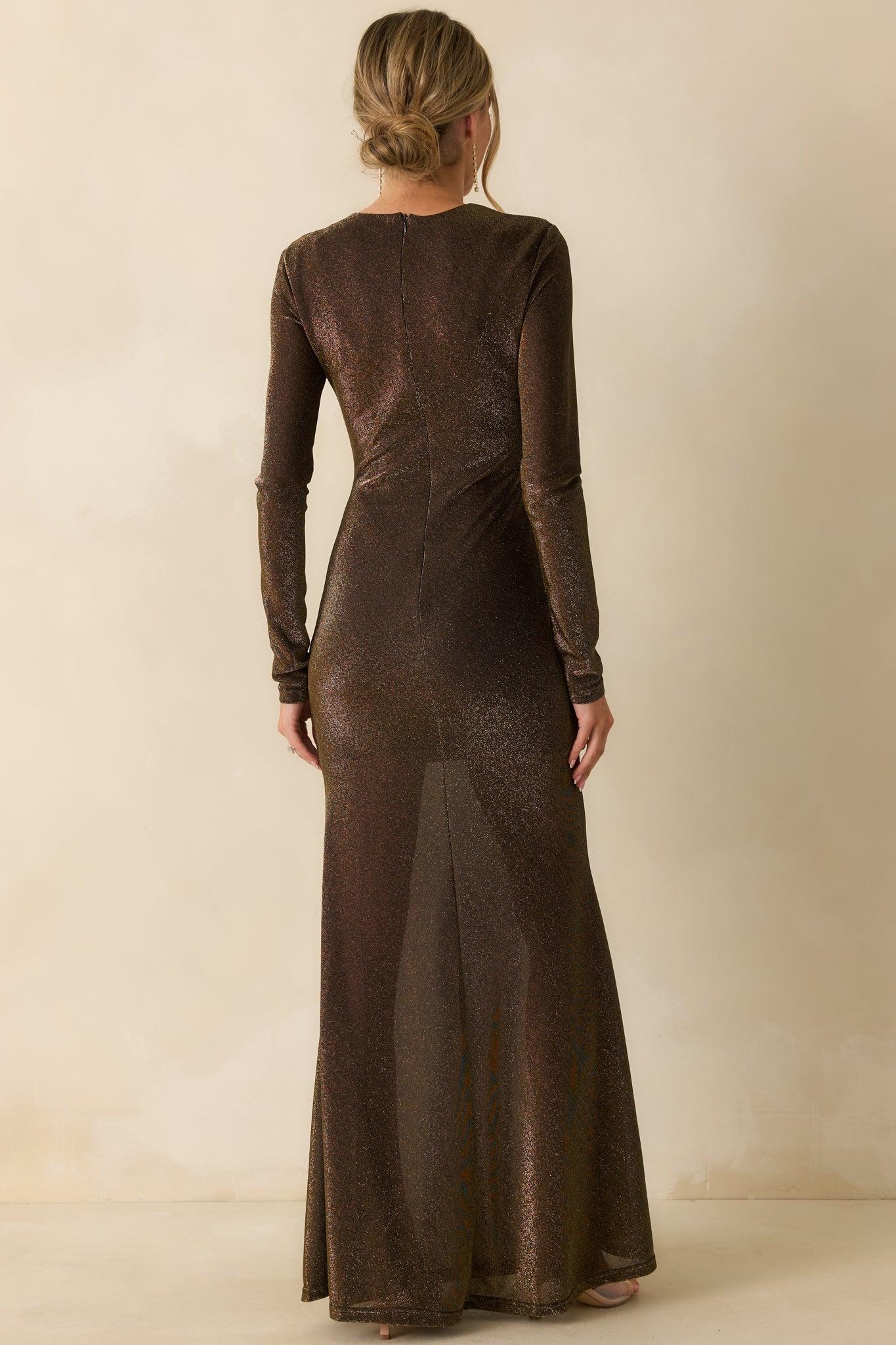 Glide into a glow that moves with you in the Veil of Light Black & Gold Long Sleeve Metallic Maxi Dress. This shimmering gown captures every flicker of gold against soft black, sculpting the body in stretch-knit comfort before cascading into a sheer, floor-length hem that reveals just a whisper of light. Long sleeves and a high neckline balance its radiance with refined elegance — perfect for evenings when confidence feels effortless and grace speaks softly. This black and gold maxi dress is crafted from a soft, stretchy blend and features this long-sleeves, a body-contouring fit, smooth knit lining to mid-thigh, a semi-sheer shimmer overlay through the legs, a high crew neckline, and a concealed back zipper closure for a sleek, flawless finish. 65% Nylon & 35% Polyester Lined: 100% Polyester Hand Wash Cold Manufactured in China Designed in The USA Model is 5'8" and is Wearing a Size Small