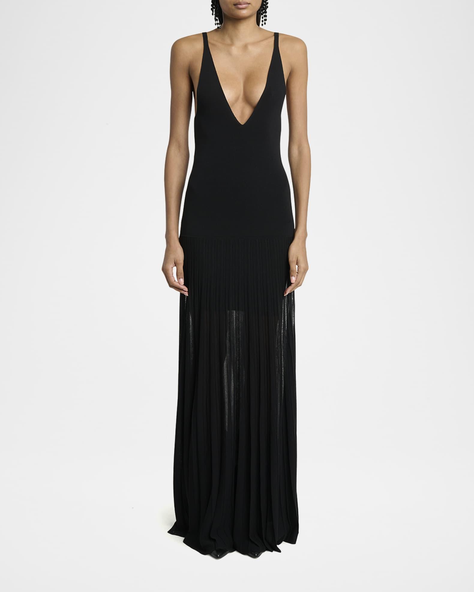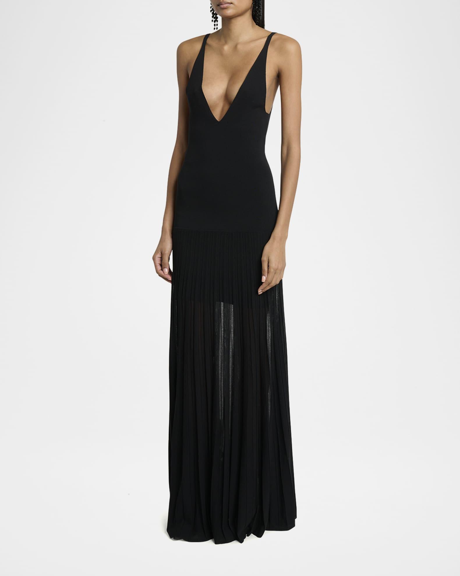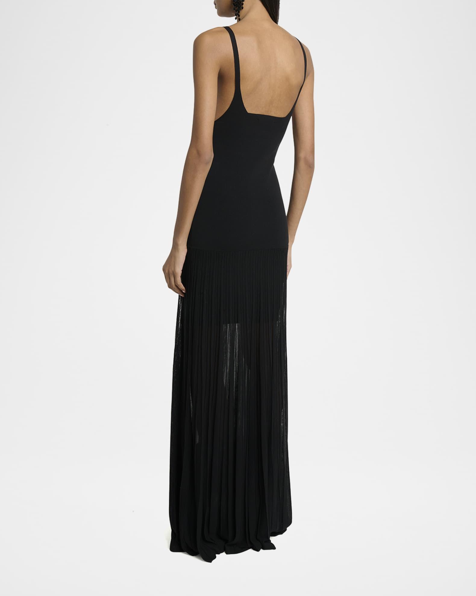 Isabel Marant "Velma" crepe knit dress with a pleated sheer skirt Low-cut V neckline Sleeveless Slim bodice with Intended to hit the floor Slipover style Cotton/viscose/nylon/polyamide Dry clean Imported