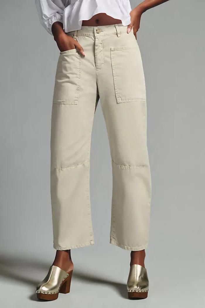 The Brylie pants from Velvet are made in the U.S.A. from cotton. They’re a low-rise style with balloon legs.
