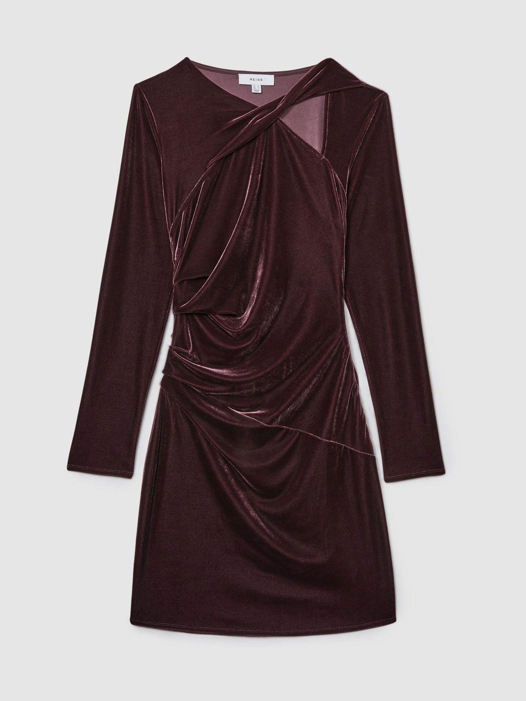 The Alba mini dress is cut from plush velvet with a hint of stretch. The asymmetric cut-out neckline and elegant draping create added interest. Velvet Metallic thread Asymmetric cut-out neckline with twist Draping Concealed side zip
