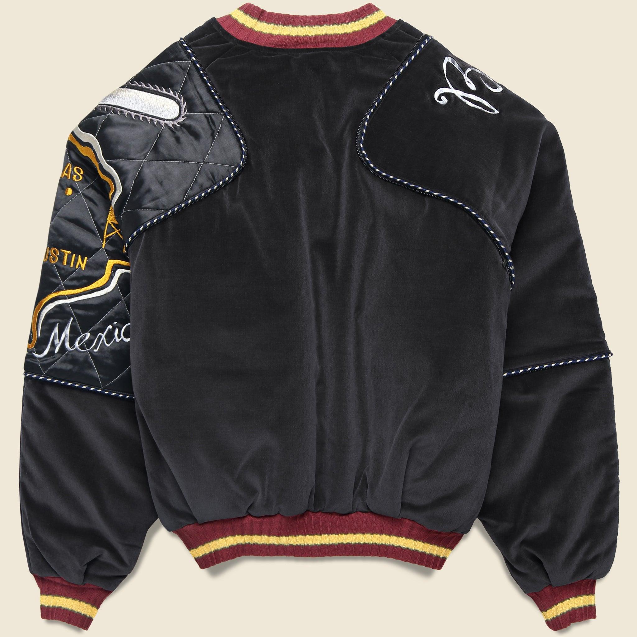 An eccentric take on the classic bomber jacket, the Velveteen Bomber Jacket from Kapital is made from luxurious rayon and velveteen that’s designed with large panels at either shoulder that zip up to convert it into a comfy pillow. Featuring a soft, diamond-quilted construction for extra comfort and warmth, it’s finished with a zip placket, two welt hand pockets, and custom “Beautiful Texas” embroidery at both shoulders to top things off with incredible detail. Soft velveteen outer with a rayon lining Diamond-quilted interior construction Velveteen and rayon shoulder panels Creatively converts into a sham pillow Zip placket Striped cotton ribbing Custom embroidery on both shoulders Welt hand pockets Oversized fit We recommend taking your normal size Made in Japan Materials: Body: 100% cotton | Left Shoulder: 100% rayon | Lining: 100% rayon | Padding: 100% polyester | Ribbing: 100% cotton The following measurements are for size 3: Chest: 50" | Shoulder: 22" | Sleeve: 34" | Length: 23 ½”