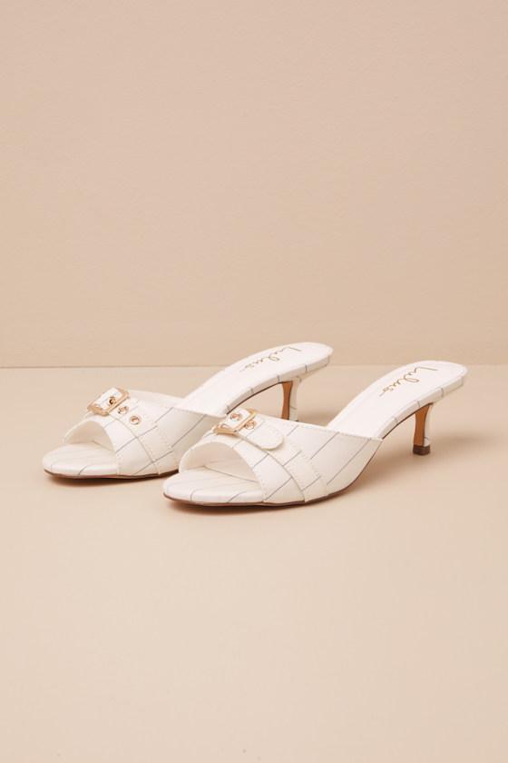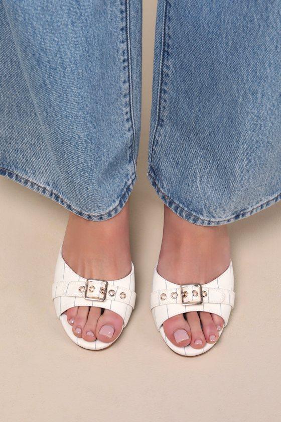 Vendela White Pinstriped Buckle Kitten Heel Slide Sandals