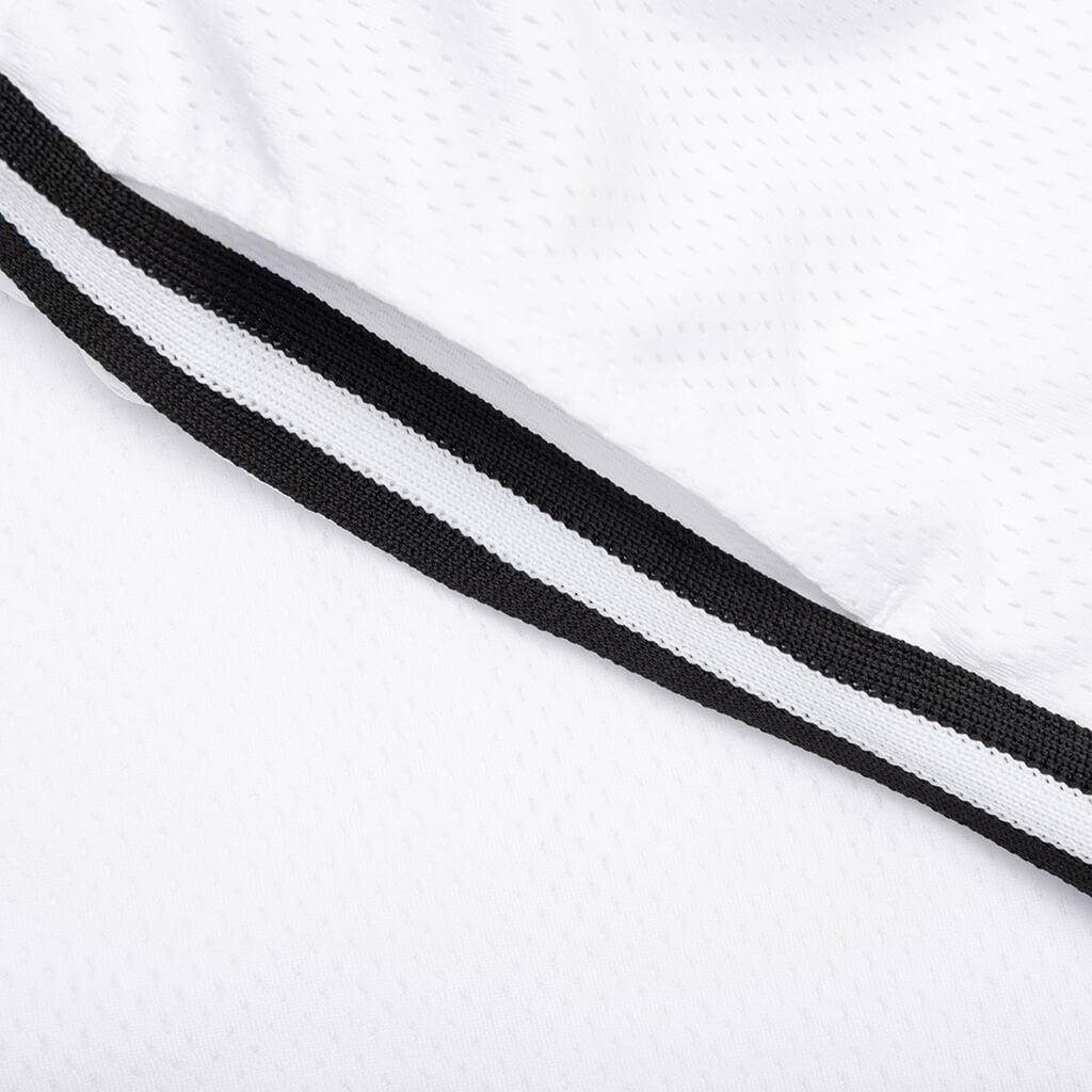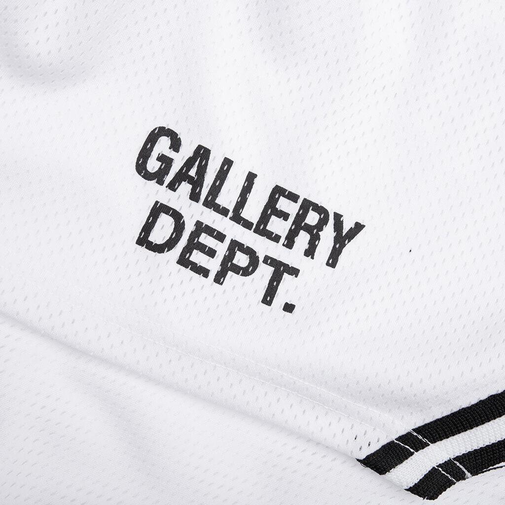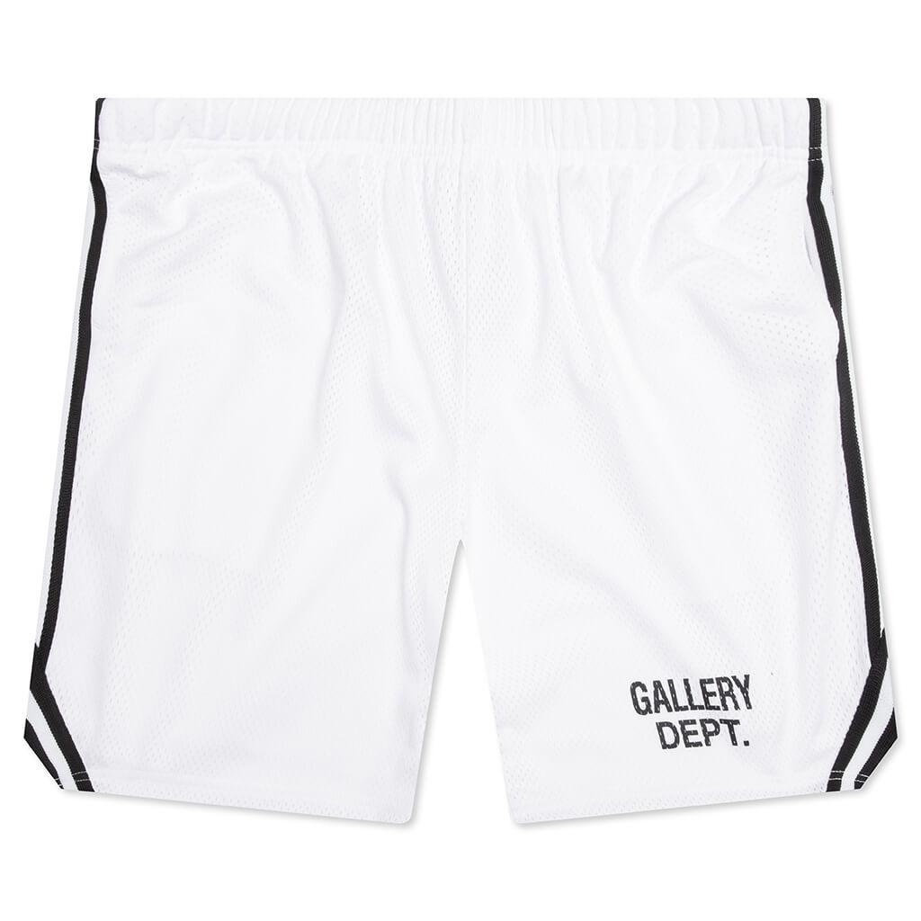 The Gallery Dept. Venice Court Shorts deliver a modern update to a classic athletic silhouette. Made from breathable mesh jersey, they feature a slightly shorter 8.25" inseam for a contemporary fit. The balloon shape offers relaxed comfort, while the elastic waistband with inner drawstring ensures a secure feel. The shorts are finished with front slip pockets, white striped piping, and the GD ENGLISH logotype at the front. They are double-lined for added structure and durability. Made in the USA. 100% Polyester Breathable mesh 8.25" inseam GD ENGLISH Logotype Balloon fit Elastic waistband Interior drawstring Side seam pockets Striped piping Double-lined Style No: VCS-5245-WTBK VCS 5245 WHIT
