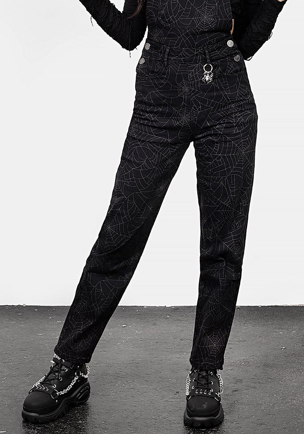 Do you know fear?- Black printed denim mom dungarees - Regular mom fit jeans (with bib) for a carefree fit - High-rise waistband with belt loops to accessorise - Gunmetal branded buttons on bib & hips provide a secure but comfy fit - Five pocket design (two front, two back, one bib) for easy access to essentials - Stretch denim fabrication (your circulation will thank you!) - Spiderweb discharge print for a crisp & long-lasting design - Antique silver spider charm hangs from detachable O-ring on belt loop - Branded patch on waistband so they know who sent ya - Ideal with crops or graphic tees - Don't mind if I do... 68.5% cotton, 29% polyester, 2.5% elastaneJaz is 5'7" and wearing a UK6