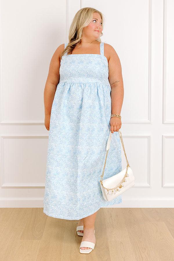 - Feel a little extra fab in this floral jacquard midi dress! Designed with a luxe textured finish, this trendy midi is perfect for brunch plans, wedding guest looks, or any stylish moment. - Floral jacquard material featuring different shades of blue - A built-in bust lining - A square cut neckline - 1 inch straps - Back zip closure - A waistline with an elastic back - Hidden side pockets - A relaxed silhouette that ends in a strength, midi length hemline
