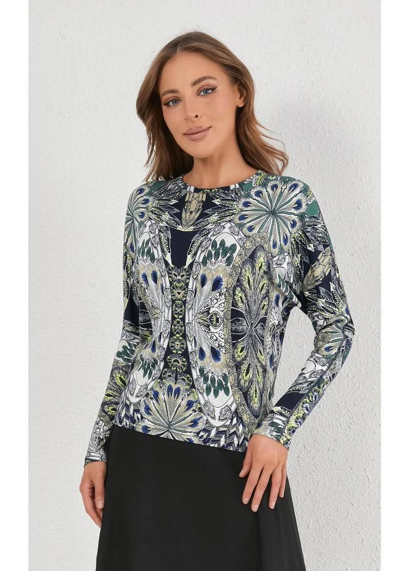 Bold, artistic, and full of movement — this kaleidoscope-inspired top features shades of green, navy, and ivory in an eye-catching print. Designed in a breathable stretch knit, it brings statement style with everyday comfort.