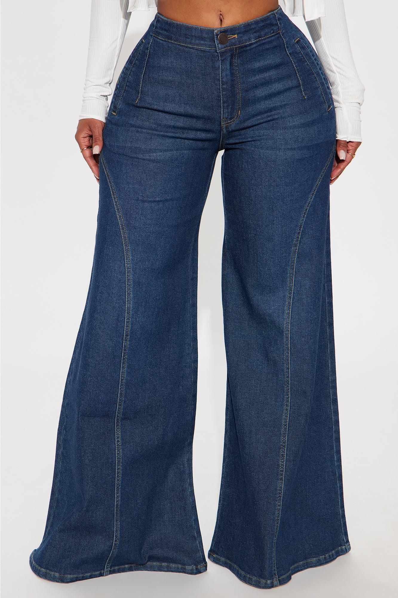 Available In Dark Wash. Super Wide Leg Jean Medium Stretch Faux Front Pockets Seaming 10" Mid Rise 33" Inseam Disclaimer Due To The Specialized Wash & Process, Each Garment Is Unique. 60% Cotton 39% Polyester 1% Spandex Imported
