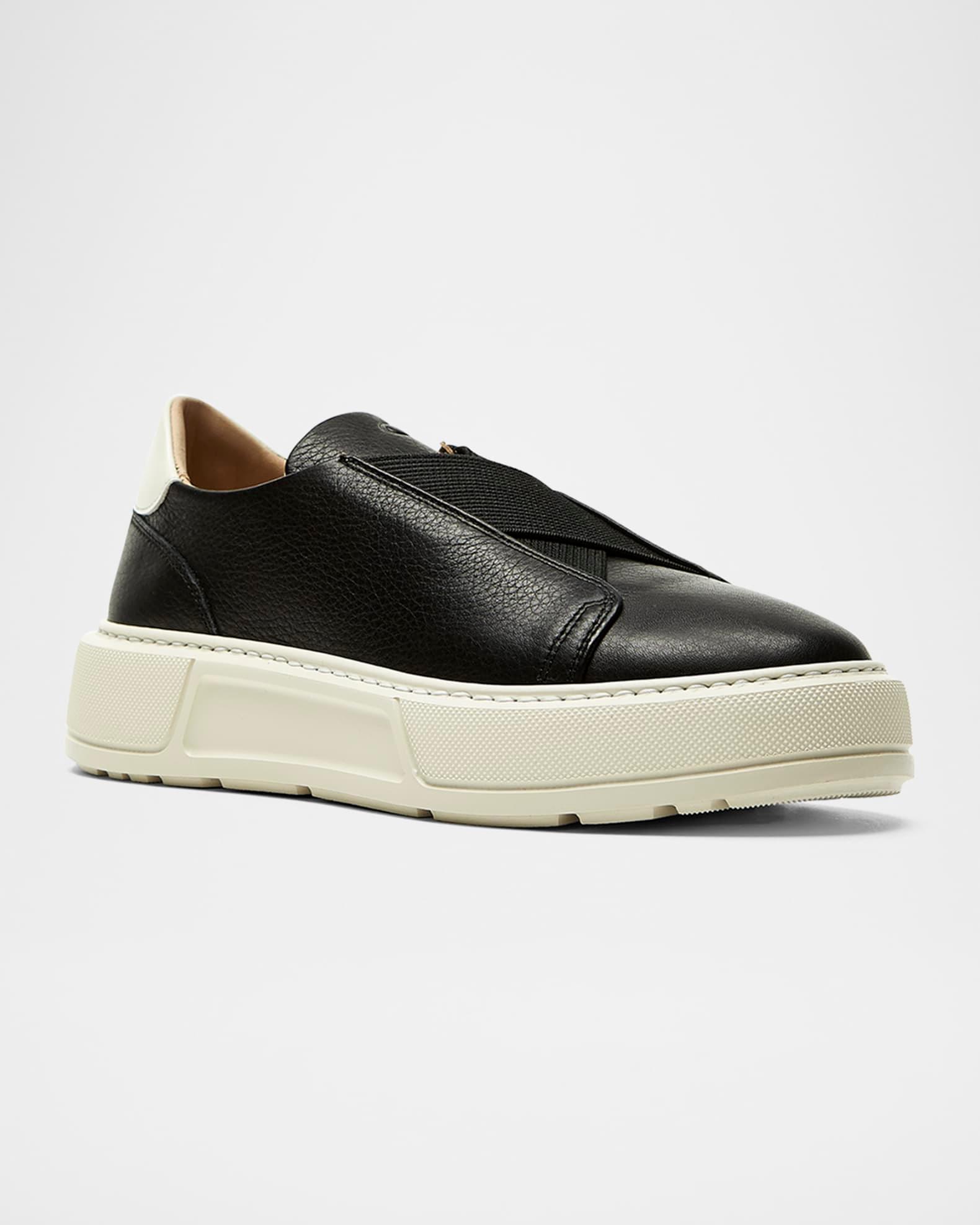 La Canadienne "Veronica" two-tone leather sneaker featuring a thick rubber sole for comfort, an ortholite insole for breathability, and a breathable leather lining. 1.50 in / 40 mm flatform heel Round toe Crisscross elastic band vamp Slip-on style Rubber outsole Lining: Leather Wipe clean Made in Italy