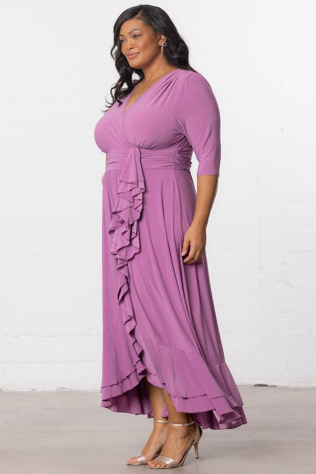 The Veronica Ruffled Evening Gown is an elegant long dress with a faux wrap design, slim 3/4 sleeves, a surplice neckline, and a ruched waistband. The gracefully sweeping skirt features ruffle details from the front waistband down through the hem to complete the look.