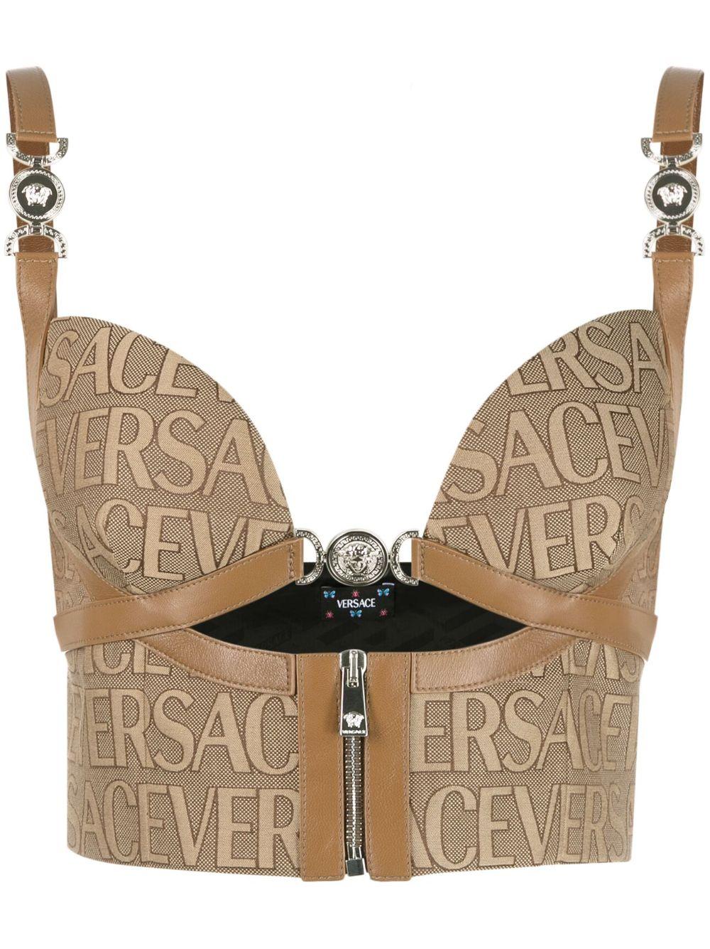 Versace boasts an all-over logo print in this corset-style crop top, embellished with Medusa plaque detailing to create a modern, branding-focused finish.
