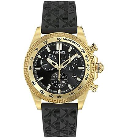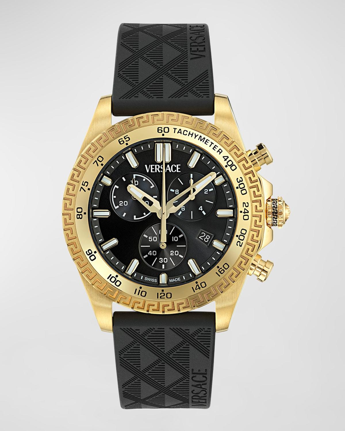 Versace "Chrono X" men's watch 44mm; polished and brushed IP yellow gold stainless steel case Sapphire crystal glass La Greca tachymeter bezel Black sunray dial; three subdials Logo at 12 o'clock Date window at 4 o'clock Recycled PU strap Adjustable prong buckle Water resistant at 5 ATM Quartz movement Made in Switzerland