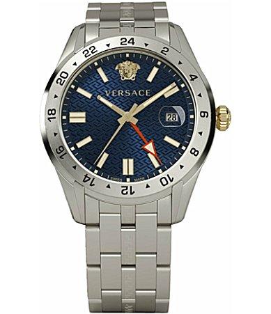 From the Greca Time GMT Collection. With GMT quartz movement, Versaces Greca Time GMT timepiece features a sleek dial enriched with the La Greca pattern and a 3D Medusa at 12 oclock. The stainless steel bracelet and a date display at 3 oclock complete this accessory. Quartz movement Fixed bezel Sapphire crystal Screw-down crown Blue guilloch dial Bar indices Date display at 3 oclock Second hand Stainless steel case and bracelet Deployant buckle Two-year warranty and two-year extension Made in Switzerland FEATURES Water resistant to 5 ATM SIZE Round case, about 41mm (1.61) Strap, about 20mm (0.79) ABOUT THE BRAND Founded in 1978, Versace is instantly recognizable by the signature Medusa head logo, chosen by founder Gianni Versace for its Greek symbolism. The Italian label is known for its luxe, bold clothing, sneakers, shoes and accessories-think gilding, oversized logos and punchy prints. Since taking over artistic direction, Giannis sister Donatella Versace has maintained the brands strong identity, with a renewed vision to give customers the ultimate freedom to express themselves. Men Accessories - Watches And Gifts > Versace > Saks Fifth Avenue > Barneys. Versace. Color: Stainless Steel.