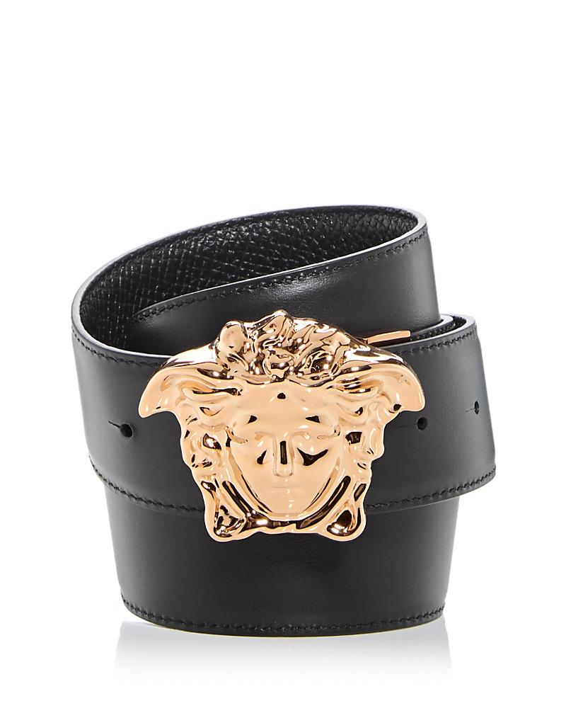 Versace belt in calf leather. Golden Medusa head buckle. Leather keeper strap. Approx. 1.5W. Adjustable fit. Made in Italy.