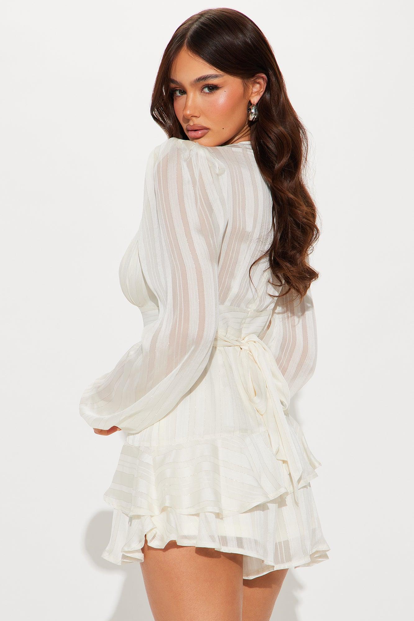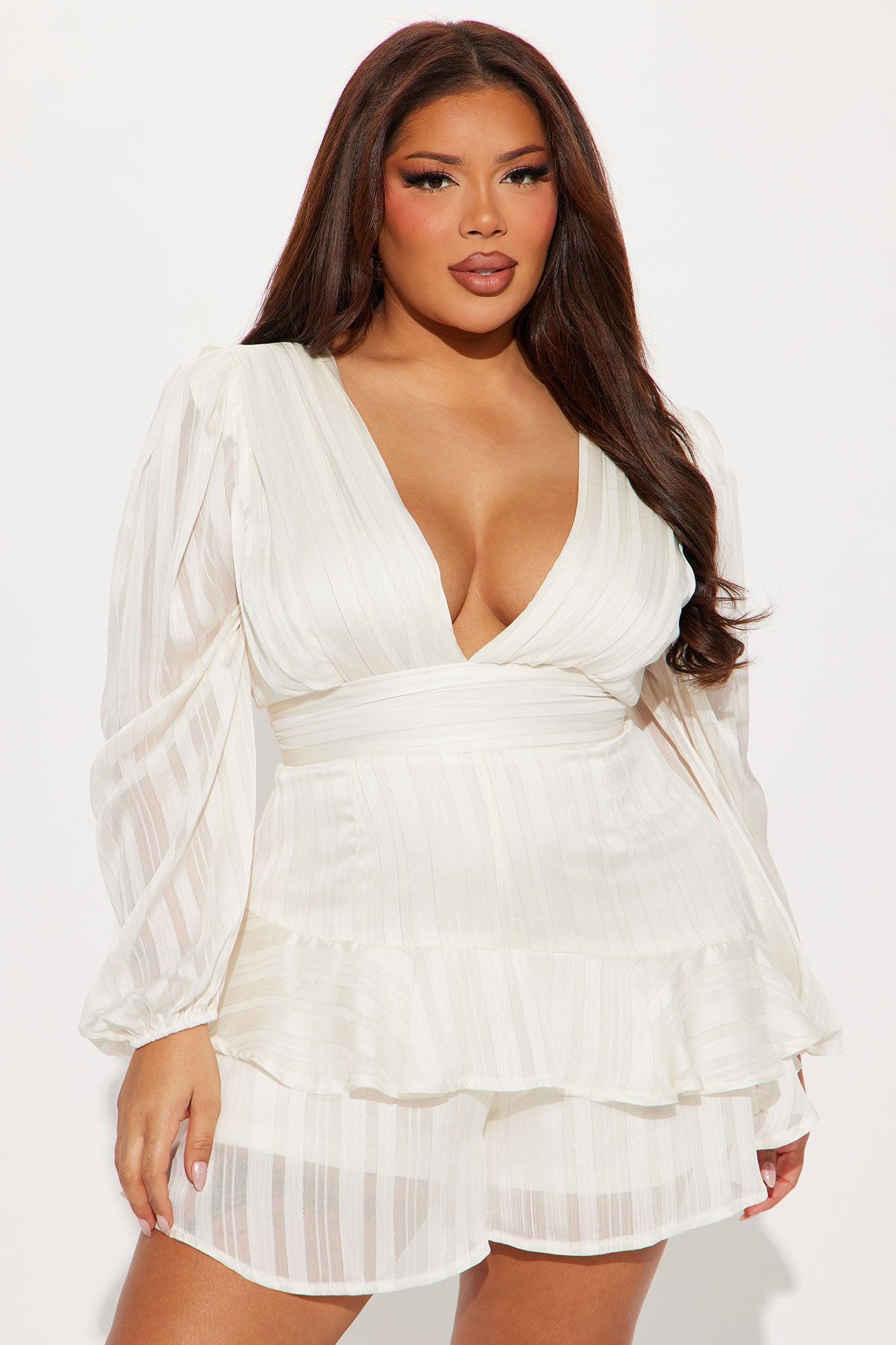 Available In Black And Ivory. Satin Romper Deep V Neckline Long Sleeves Back Tie Invisible Back Zipper Closure Lined Ruffle Hem Non Stretch Self: 100% Polyester Lining: 100% Polyester Imported