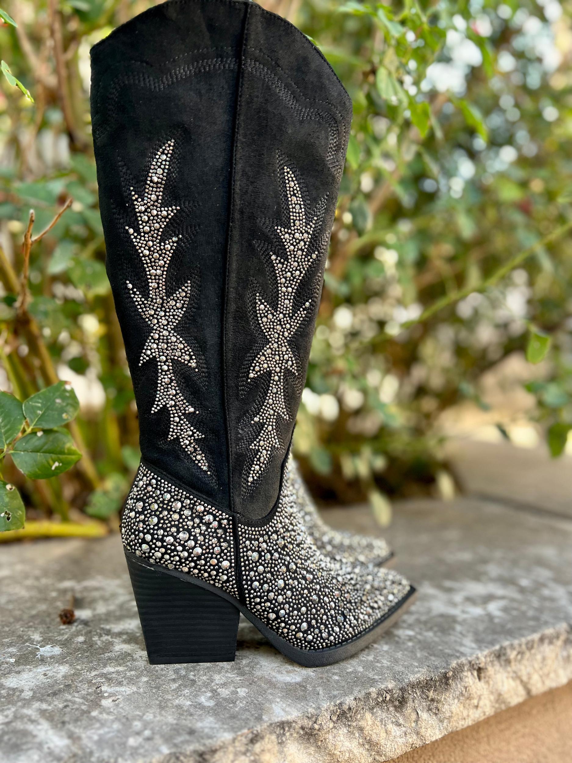 Very G Black Rhinestone Western Style Boots | GussieduponlineWomen's Western Style Fashion Boots with Rhinestones. Comfortable boots. Add Glamour to any party with these "Addie" Black Rhinestone Boots with ankle silver rhinestone detailing and side flared out feathered detailing. These boots have a Pointed Toe Silhouette, side zipper closure, 3" wooden block heel, 14" calf length from ankle to top of bootie. 17" total inches tall from sole to top of Bootie. These boots are made of a soft suede like material.