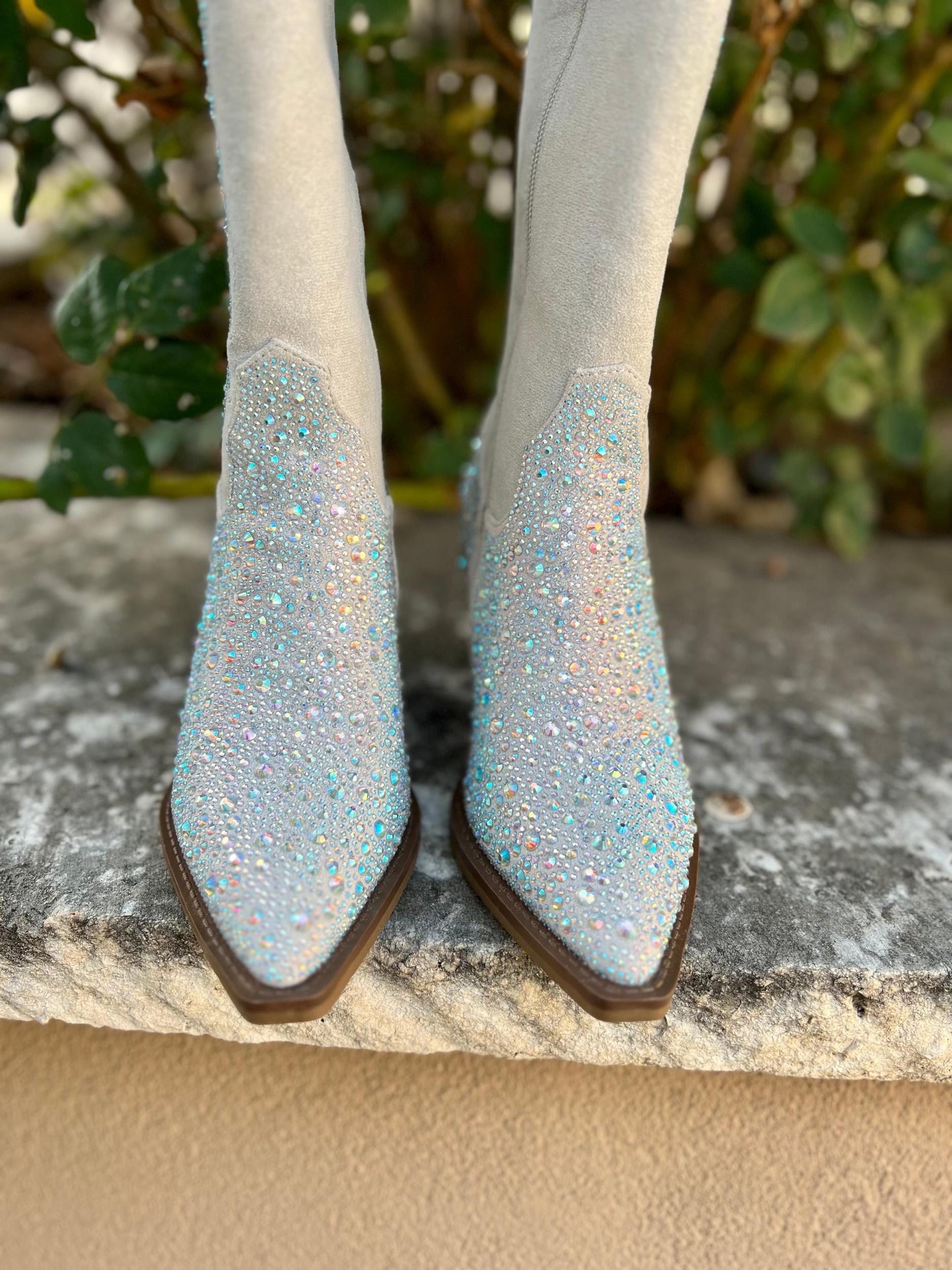 Very G Grey Rhinestone Western Style Boots | Gussieduponline Comfortable women's western style boots. Fashion shoes for western style.Add Glamour to any party with these "Addie" Grey Rhinestone Boots with ankle iridescent rhinestone detailing and side flared out feathered detailing. These boots have a Pointed Toe Silhouette, side zipper closure, 3" wooden block heel, 14" calf length from ankle to top of bootie. 17" total inches tall from sole to top of Bootie. These boots are made of a soft suede like material.