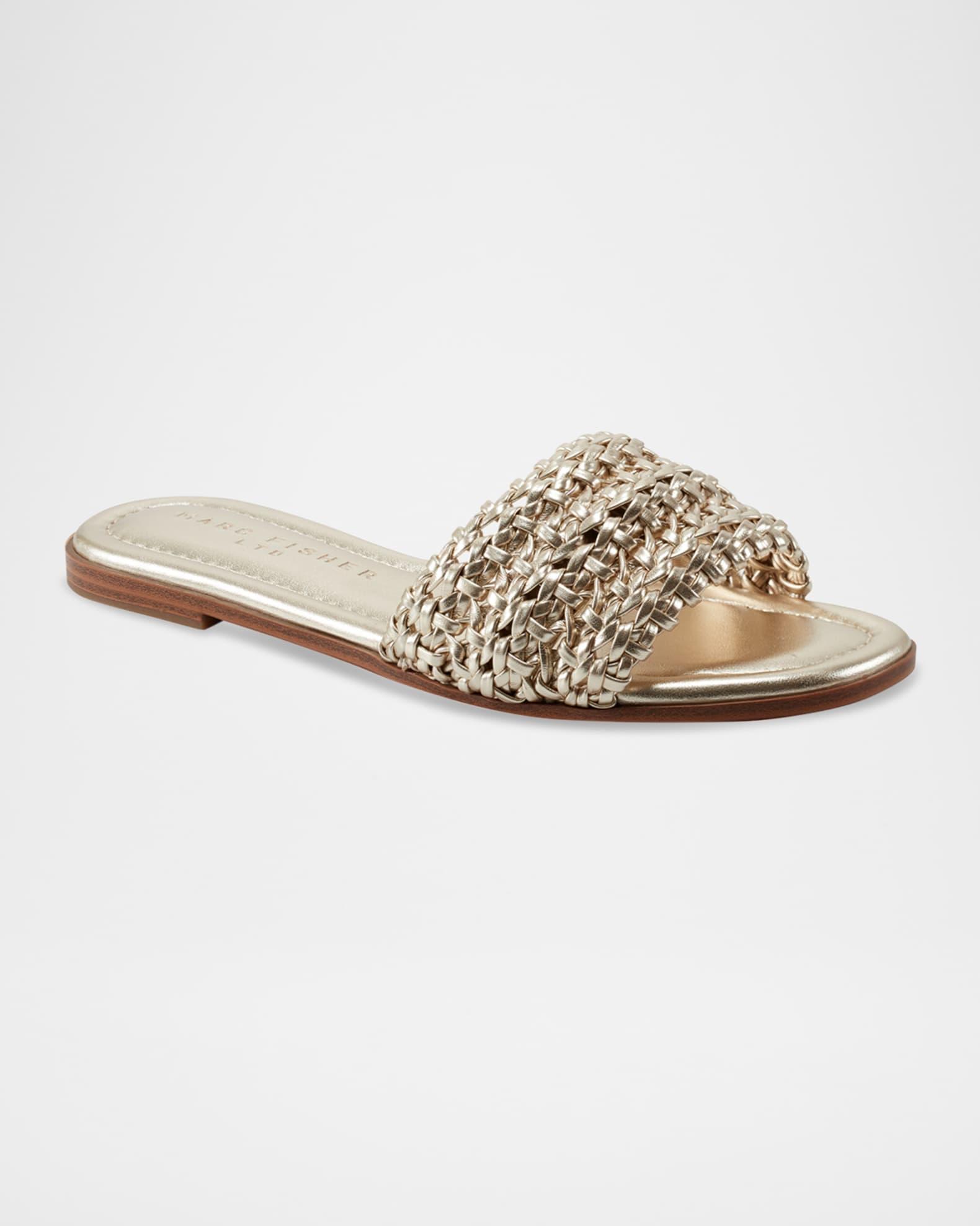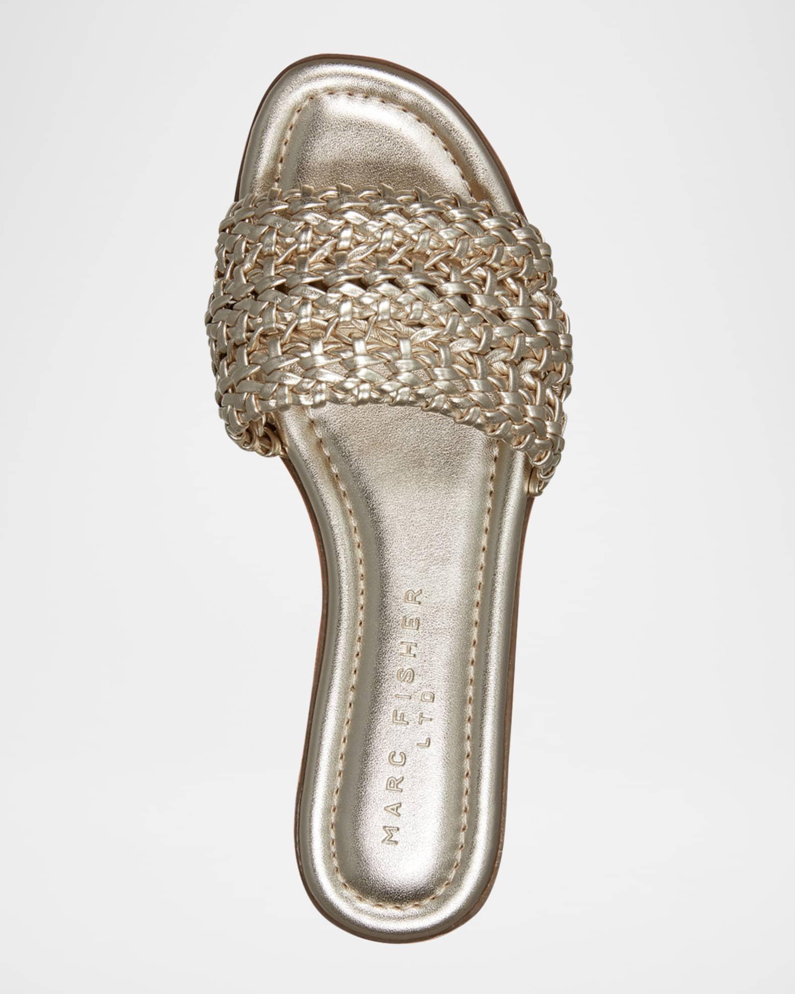 Marc Fisher LTD "Vickee" casual vegan leather (polyurethane) sandals with woven detailing Flat heel Open toe Wide band upper Slip-on style Manmade outsole Spot clean Imported Shipping Direct from Vendor, usually ships within 45 business days.