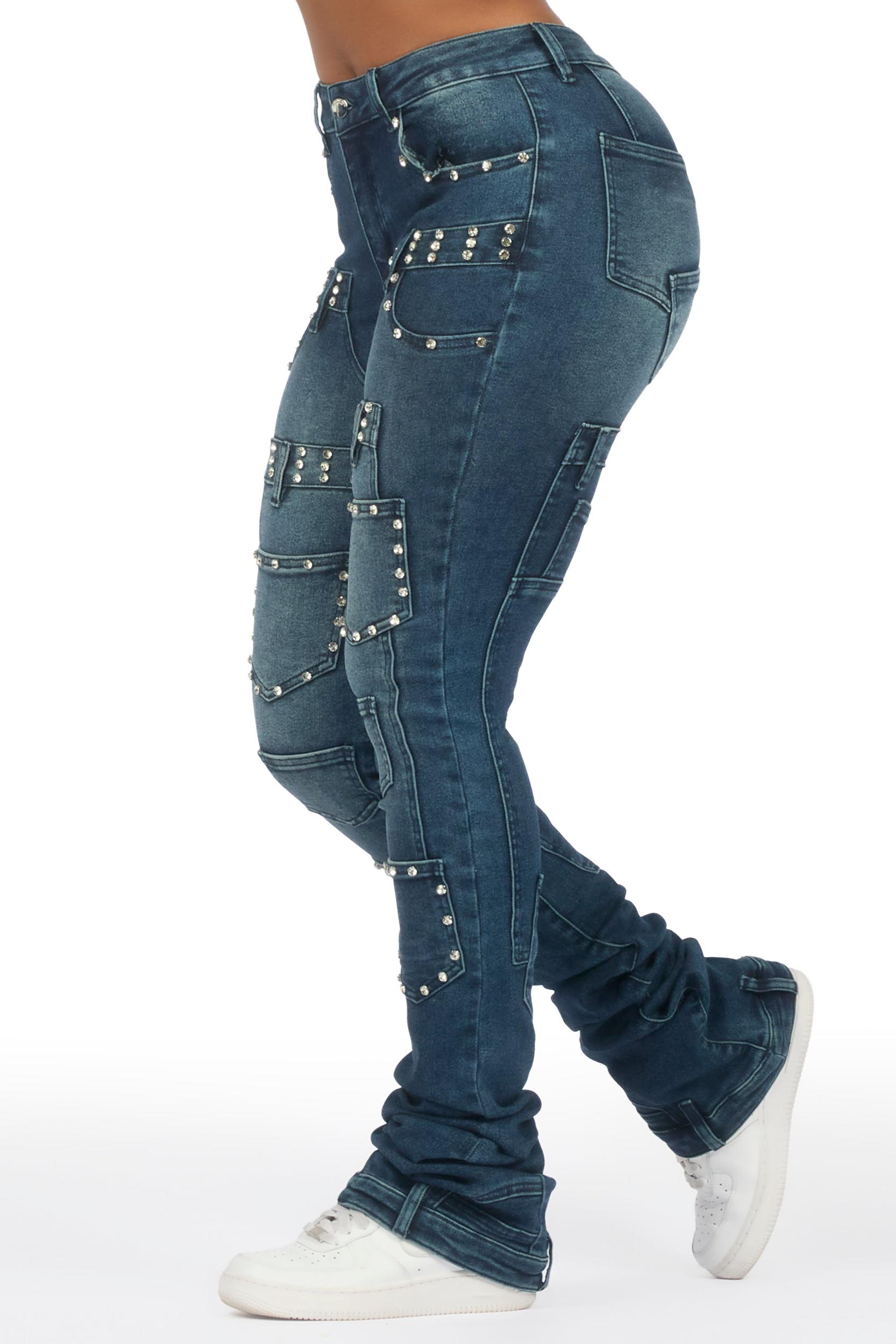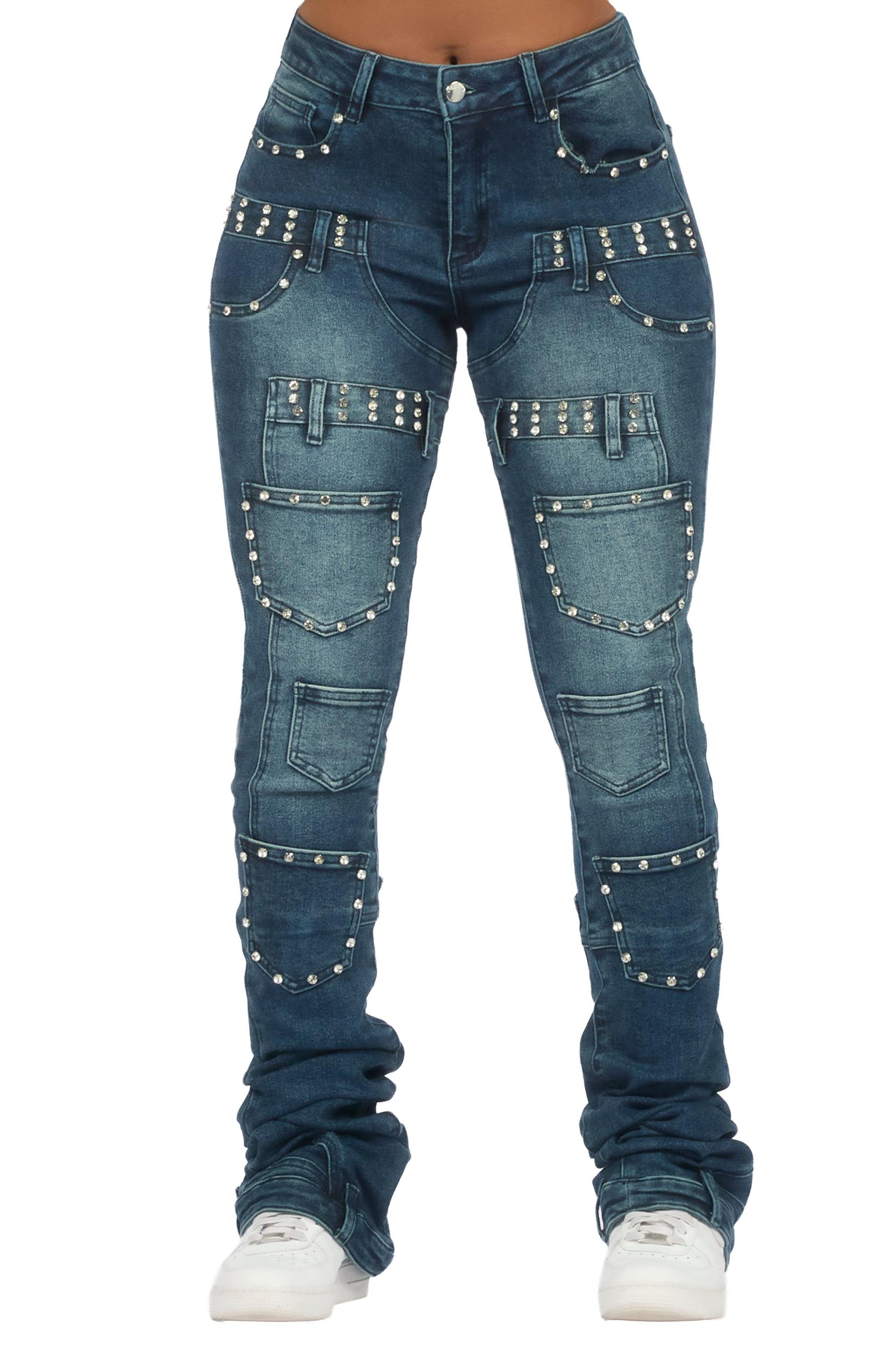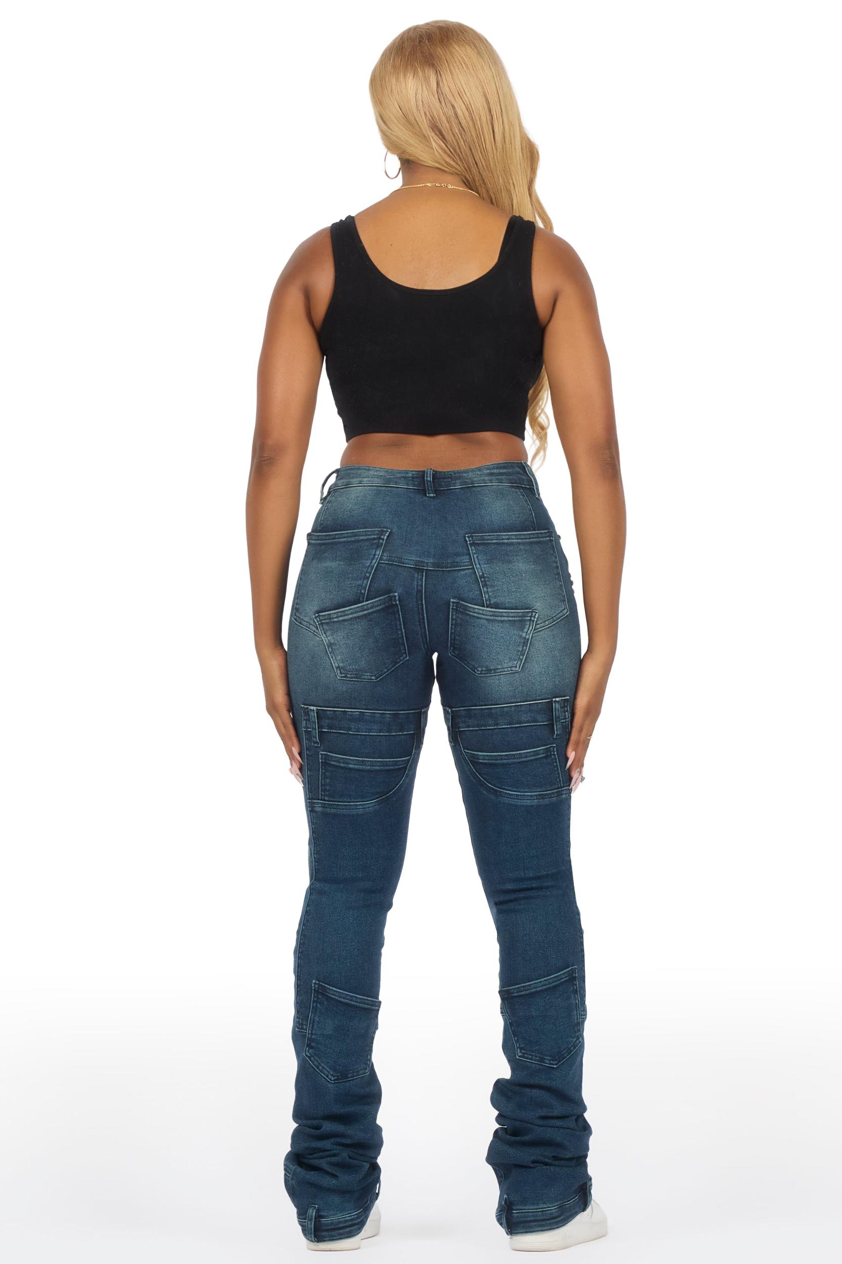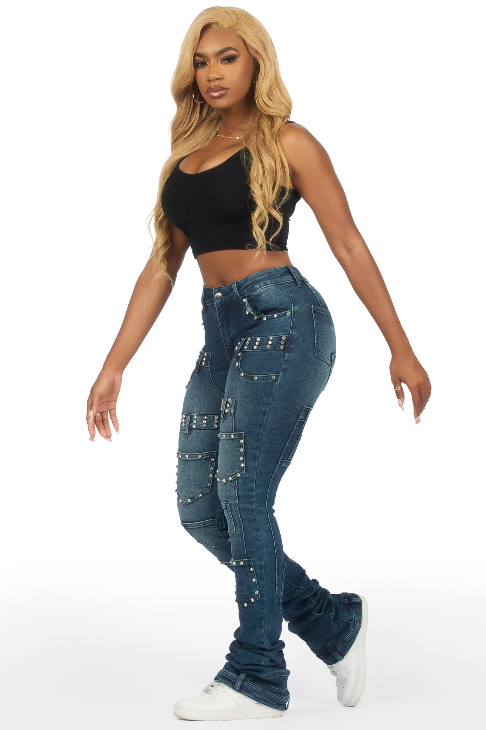 An urban super stacked cargo jean for women in dark wash. Designed with premium stretch fabric and extra long legs for the perfect streetwear style. Zip fly with button closure 11-pocket build High-waisted silhouette Fitted through the hip Flare leg openings Frayed hems Custom rhinestone detailing Super stacked construction 46" inseam