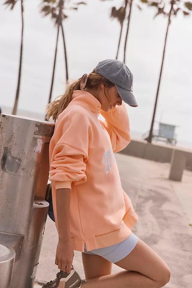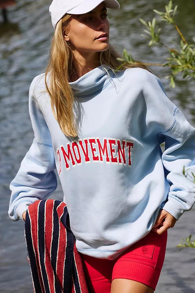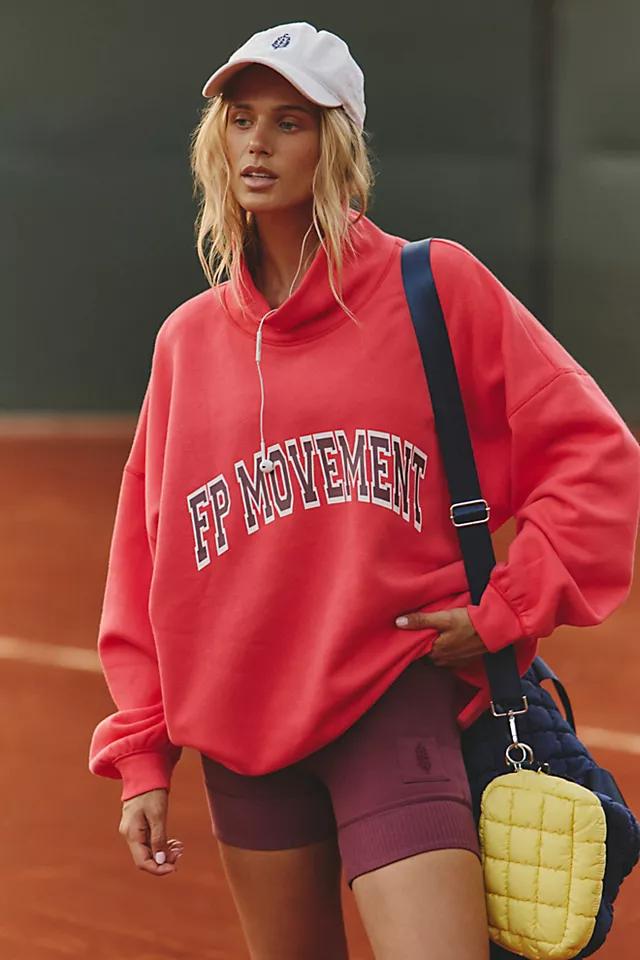 **Features:** Pullover; Funnel neckline, dropped shoulder seams, collegiate FP Movement logo at the front; Shorts: Pull-on design, ribbed trimming, mid-thigh length, stretch fit