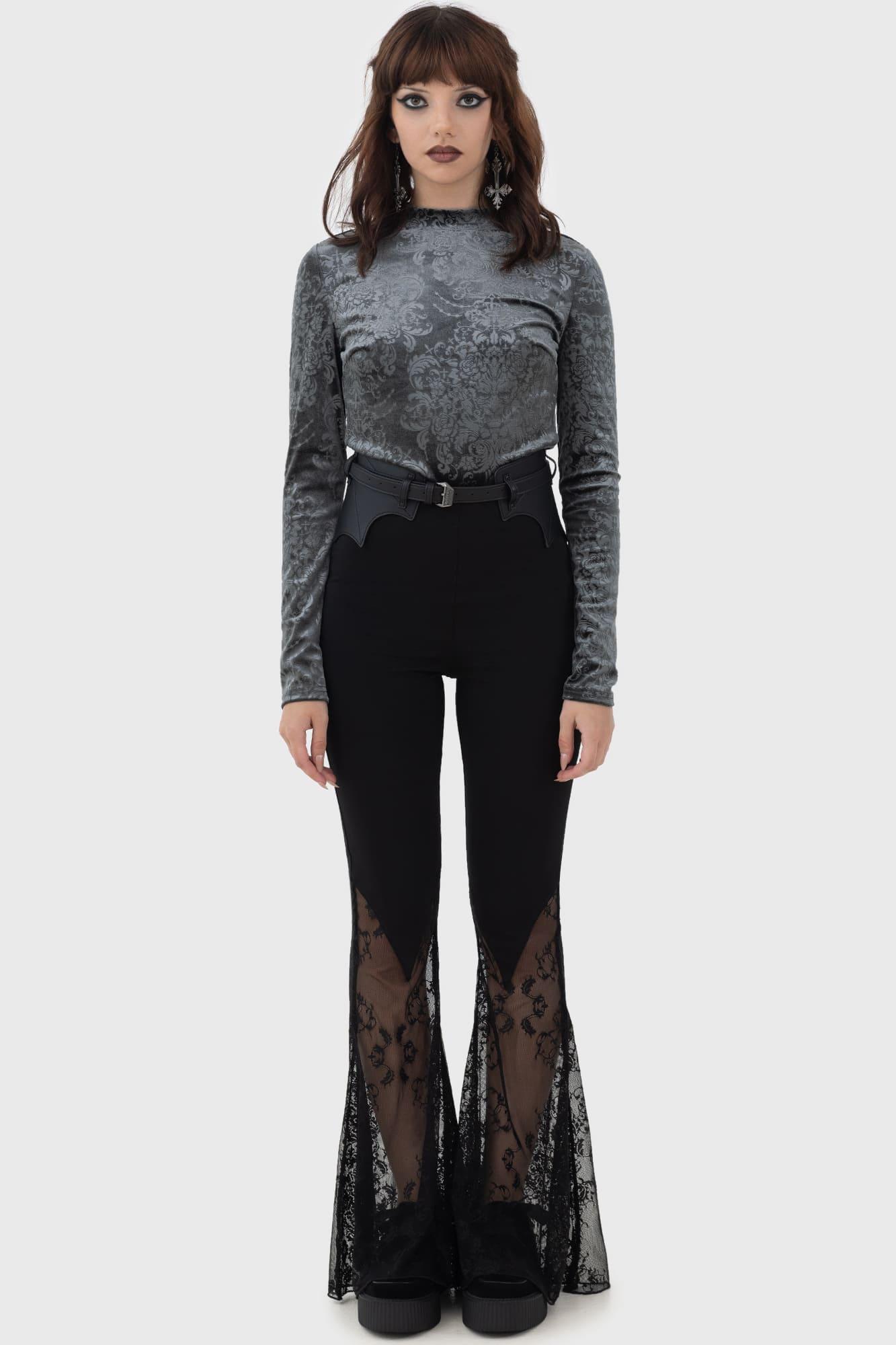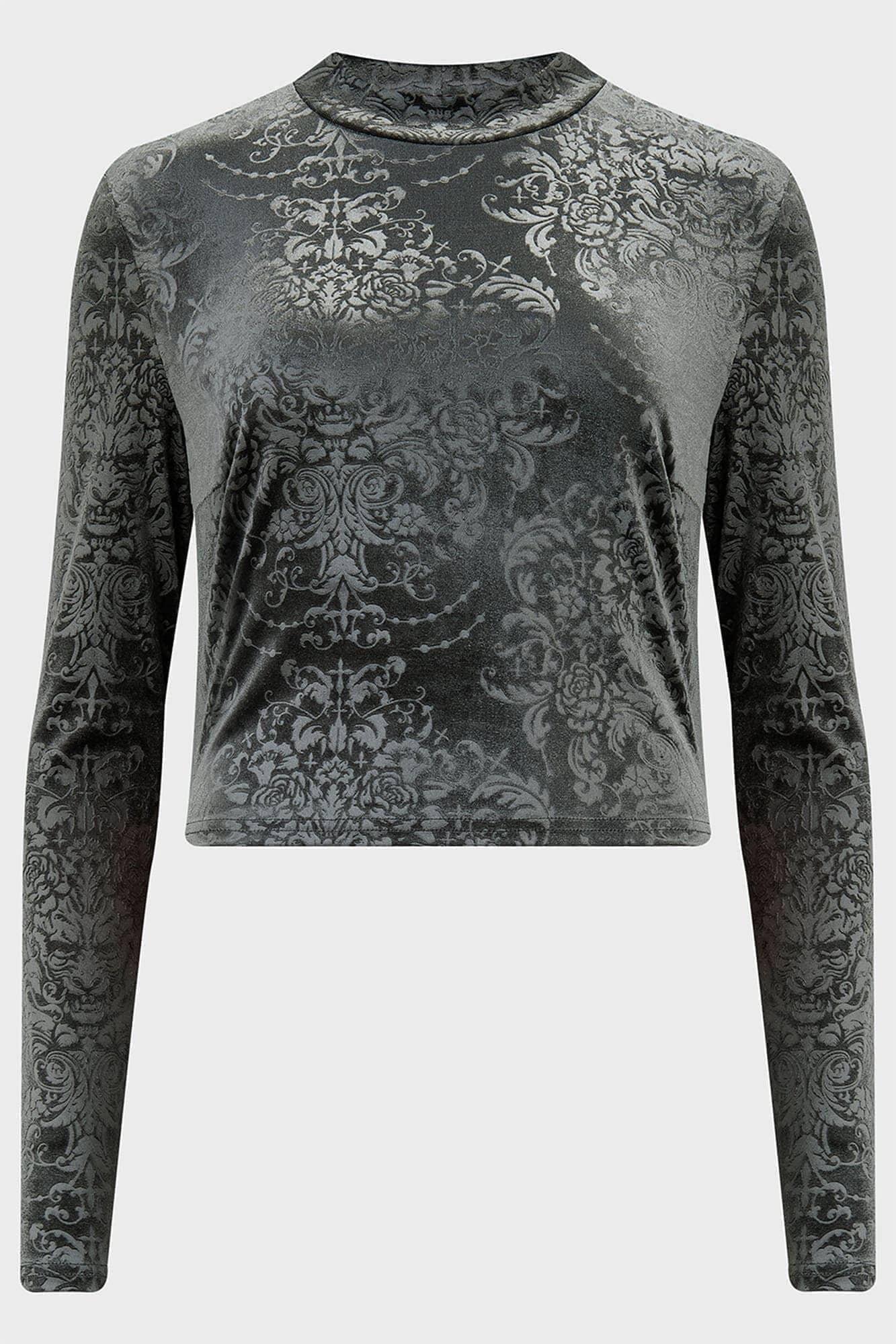 VIGIL CROP TOP.- Embossed metallic velvet.- Fiendish artwork.- Long sleeves.- High neck.- Cropped.- Fitted.With KILLSTAR branding, 93% Polyester 7% Elastane.Machine wash cold (30°c) / Do not bleach / Do not tumble dry / Do not Iron / Do not dry clean. Imported.